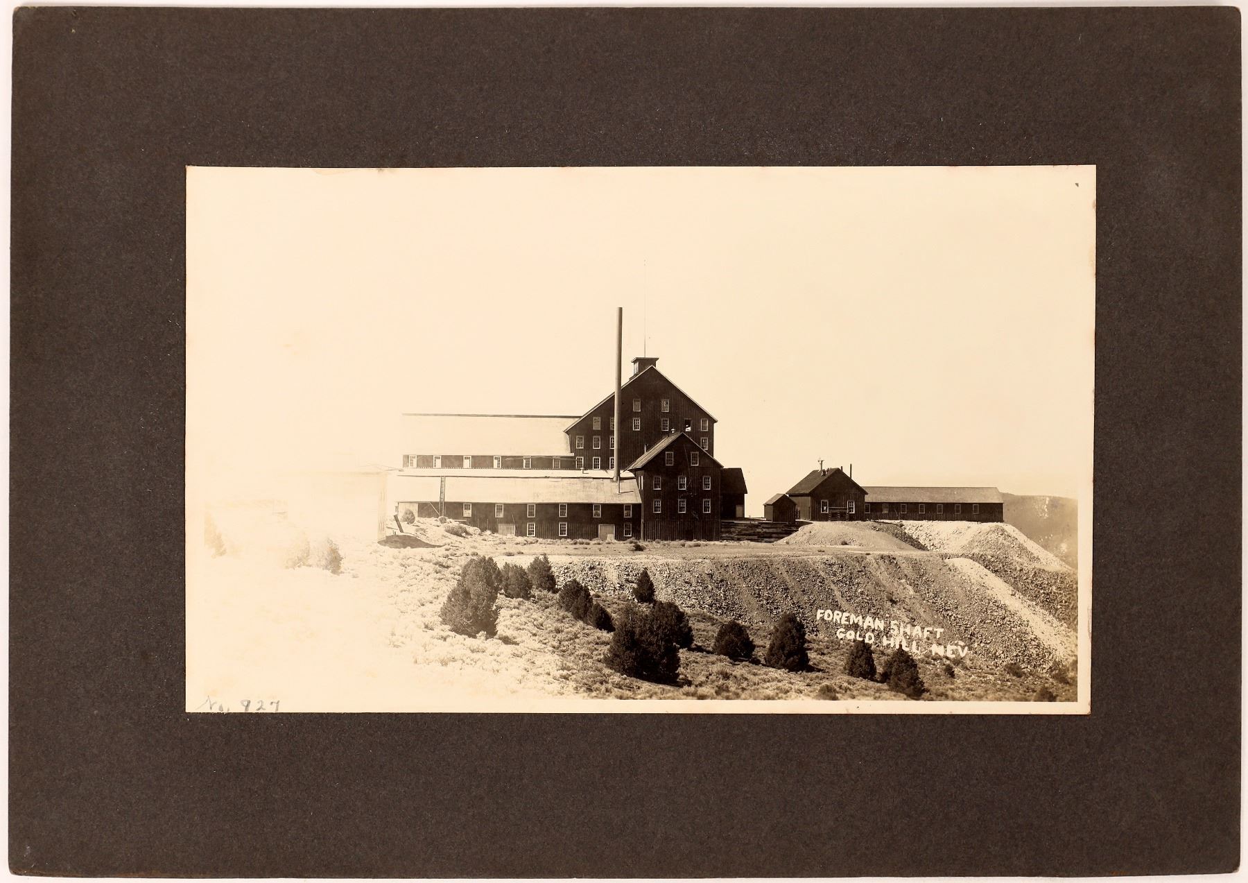 No. 927. "Foreman[sic.] Shaft, Gold Hill, Nev." No photographer listed. Probably c.1900-10. 5 x 8" photo on 7.75 x 10.75" mount. Contrast and focus good for two thirds of the photo; washed out on the left. The Forman Shaft was the Joint Shaft of the Overman, Caledonia, Belcher, Seg. Belcher, and Crown Point mining companies in Gold Hill, according to Thompson & West. Likely one of the 1870s wave of shafts sunk to chase the lode at great depth. Not listed in Ansari! Gold Hill Nevada Franklin Collection