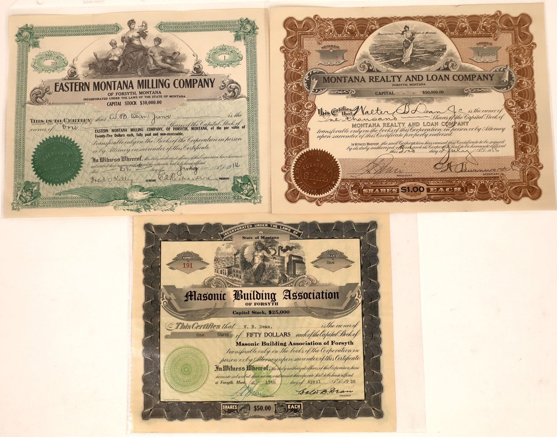 Lot of 3 different. Includes: Montana Realty & Loan Company (#4, 1916); Eastern Montana Milling Company of Forsyth, Montana (1914); and Masonic Building Association of Forsyth (1926).