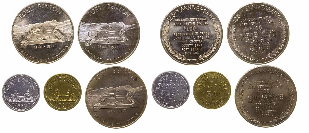 Five tokens: 3 tokens for the 125th anniversary of Fort Benton / 1846-1971 / Birthplace of Montana. 40mm each. One Fort Benton / 1860 // Baker Street / Ferry / 50 / M. L. Lynch. Round, bronze, 24mm. One restrike of Baker Street token in aluminum. State: Montana City: Fort Benton Date: FHWAC#: 41500