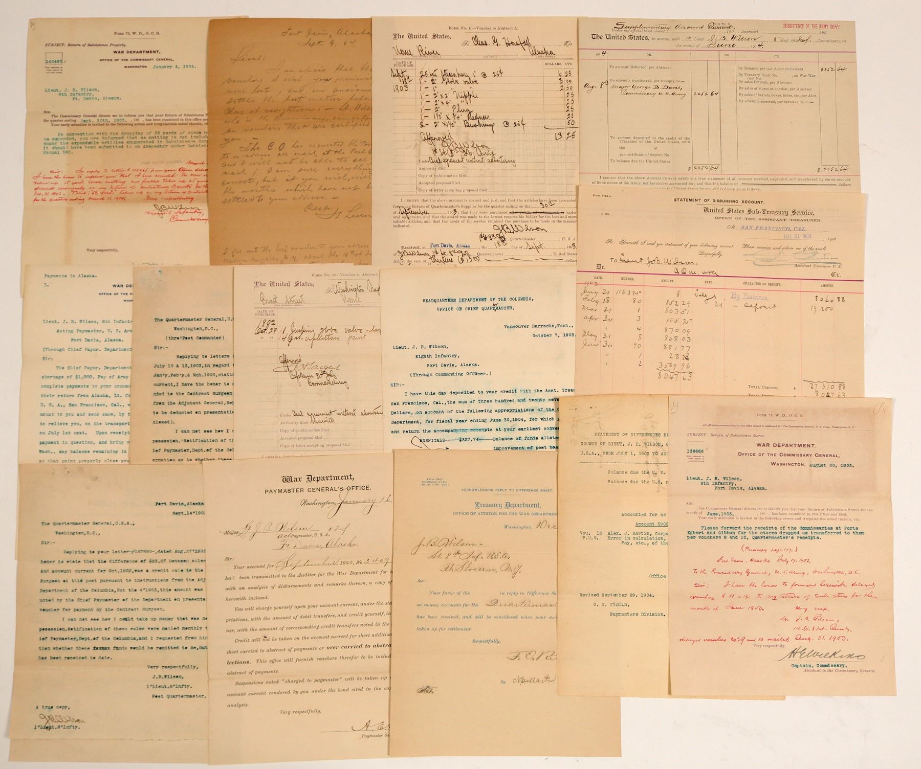 Sixteen documents that give us a glimpse of military life of a quartermaster at Fort Davis. There is one that lets Lt. Wilson know that that a shortage of $1,000 means he will not have payroll for the soldiers when they return to the fort. The money will arrive when his replacement arrives. Much of the correspondence is over perceived shortages in his reports to headquarters. One shortage was his overpayment of 27c to Corporal Alex J Martin. There was a payment to the Washington Trading Company for paint and a valve. Also an invoice to Charles Horsfall of Nome River. And, of course, there needs to be some government insanity. He was admonished for including 25 yards of cocoa netting according to Substance Manual 181. It should have been reported in Substance Manual 580. Fort Davis was a United States Army post established in the Nome Census Area of Alaska in 1900. The Nome Gold Rush led to unrest from claim jumping, claim filing errors, and a general lack of authority. The Army was sent to the Nome area to maintain order. Before Fort Davis was established, soldiers from the port of St. Michael were sent to maintain order in Nome. St. Michael was a transit harbor for the Klondike gold rush and due to its growth during the rush, a military fort was built there in 1897. Fort Davis was abandoned around 1917.