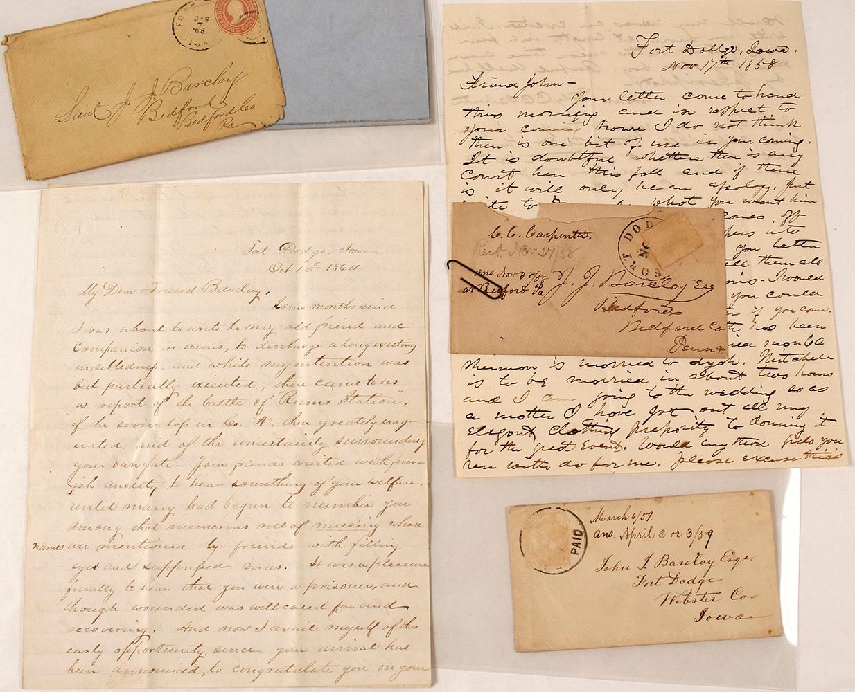 Two letters, two letters with covers and one cover addressed to Fort Dodge. Much of the content is personal, but as always there are gems. "The most of Company A have returned home. Capt. [George] Ringland arrived here a short time since , but I believe he only intends to stay a short time....His health is not good having had fever...." He wants to go into law practice when he gets out. Ringland would go on to serve in the 11th Pennsylvania during the Civil War. He would go into the manufacturing of plaster of paris and into banking in the 1860's. His house is now a museum at Fort Dodge. News about the town and there is also some Civil War news "Battle of Reams Station" for example. (Potter Collection) Date: 1858-1865 Location: Fort Dodge, Iowa HWAC# 59428
