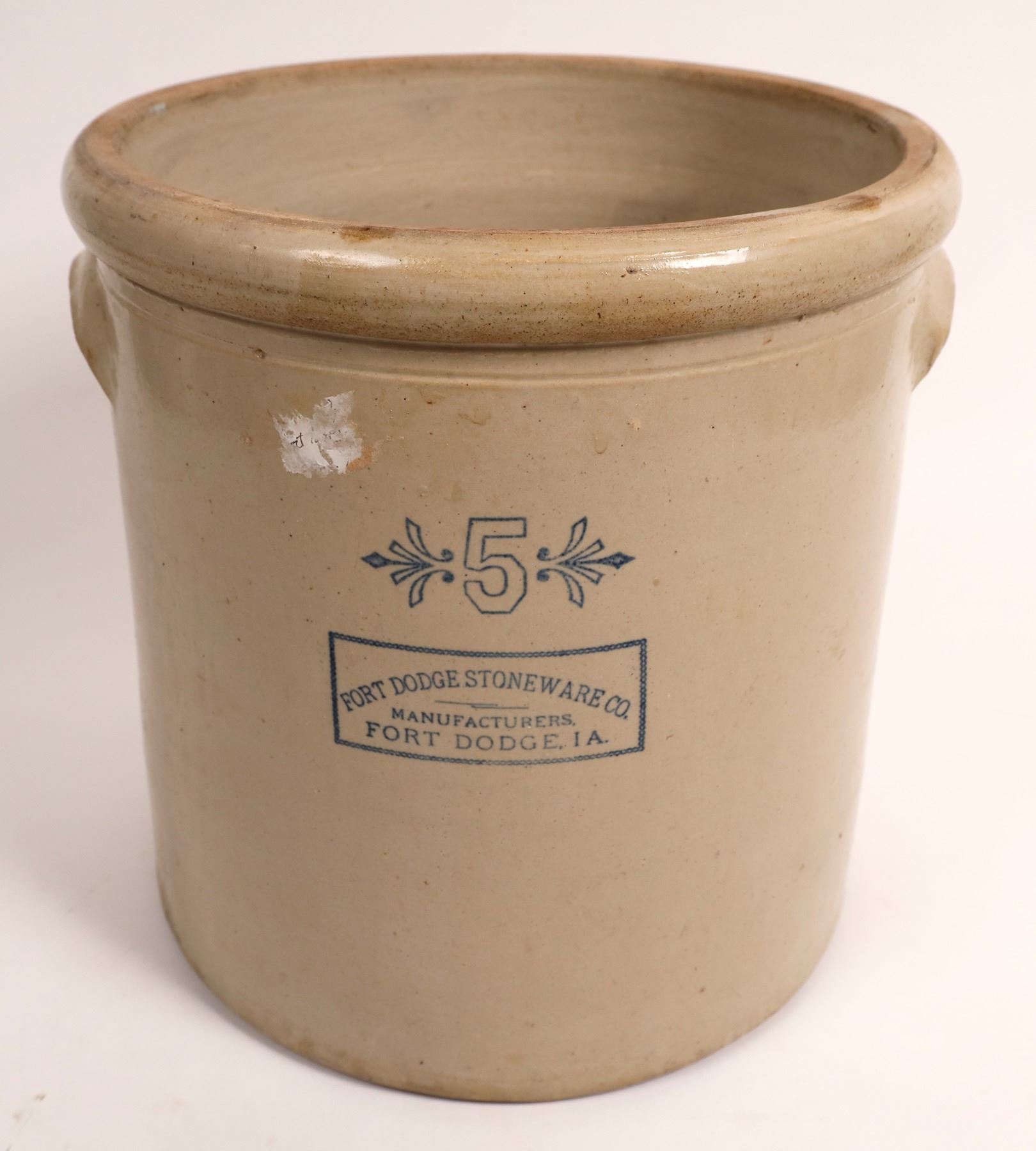 5 gallons. Fort Dodge Stoneware Co./Manufacturers./Fort Dodge, IA. 13x13". No apparent chips or cracks.