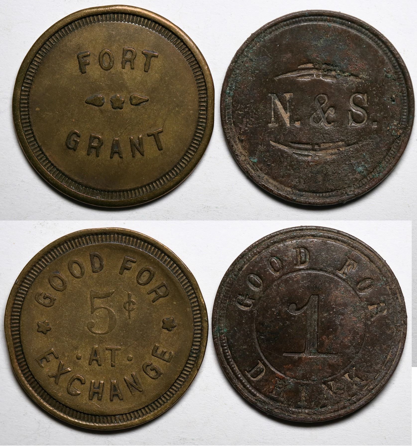Lot of 2. 1. (Design)/N& S/(design)//G.F/1/Drink. Rd., Br, 24mm. 2.Fort/Grant//G.F./5¢AT/Exchange. Rd., Br., 24mm.
