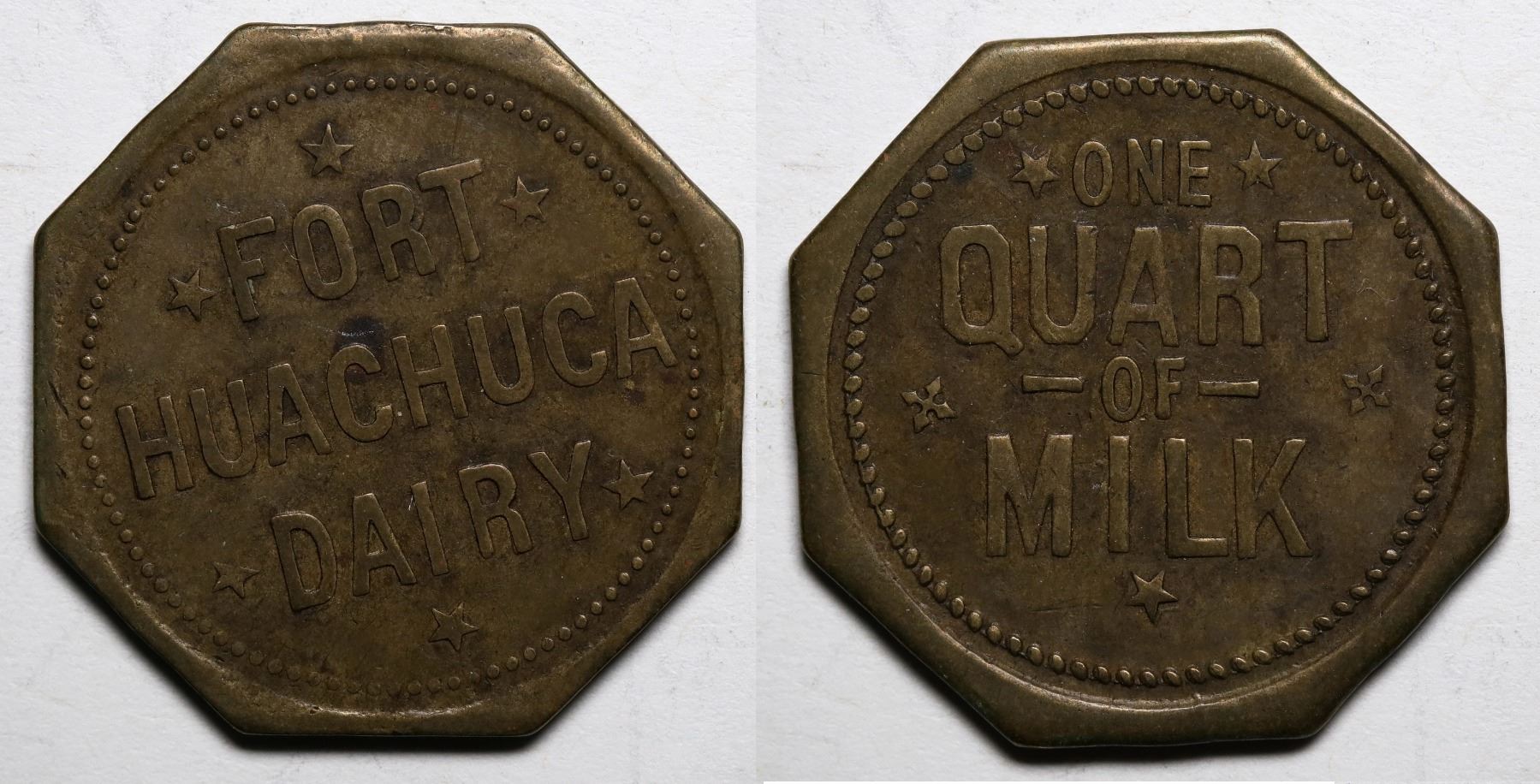 Fort/ Huachuca/Dairy//ONE/Quart/ Of - /Milk/. Oct., Br., 24mm, R-9. Fort Huachuca is a United States Army installation, established on 3 March 1877 as Camp Huachuca. The area is so desolate and barren, an old army description of the fort states, Still active, great museums. "It is the only fort in the Continental United States where you can be AWOL (absent without leave) for three days and they can still see you leaving".