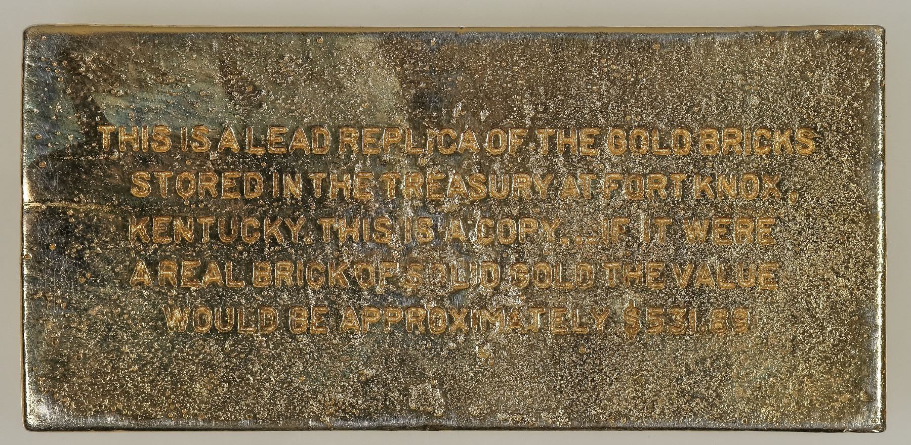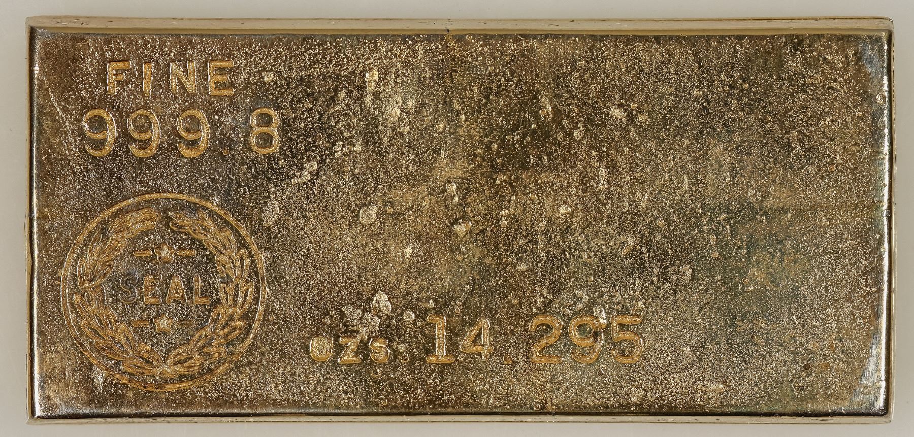 Ingot stamped FINE 999.8 / Seal / ozs. 14.295. 4 inches by 1 1/3 inches by 1/2 inch. The reverse reads: "This is a lead replica of the gold bricks stored in the Treasury at Fort Knox, Kentucky. This is a copy...if it were a real brick of solid gold the value would be approximately $531.89. (that means gold was selling for $37 an ounce when this bar was made) (It would be worth $33,264 today!) [] [] [] [] []