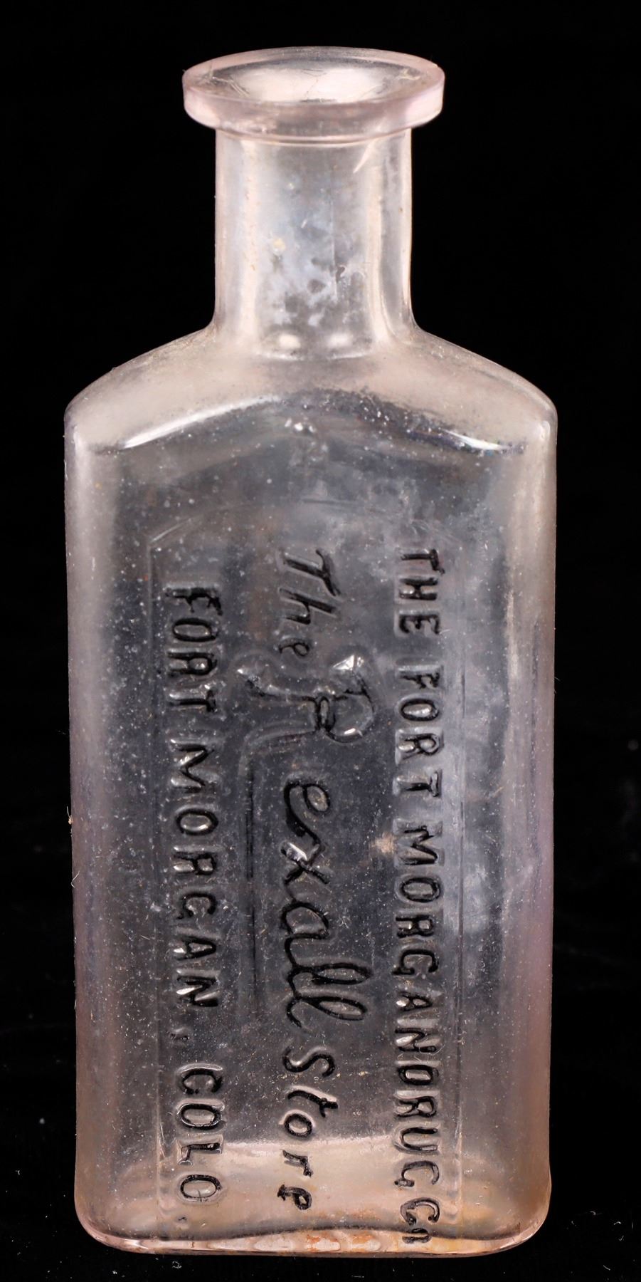 R4 in Preble. Black embossed The Fort Morgan Drug Co/The Rexall Store/Fort Morgan, Colo. 4.25". No apparent chips or cracks.