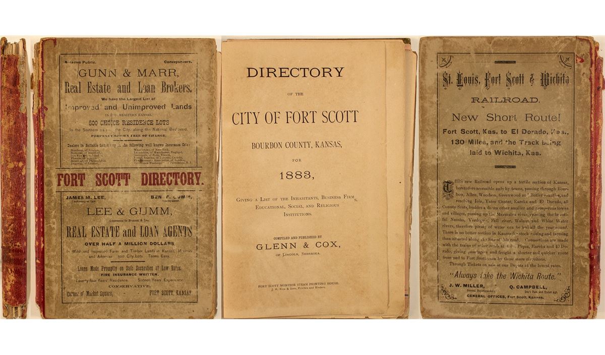 Directory of the City of Fort Scott, Bourbon County, Kansas, for 1883, Giving a List of the Inhabitants, Business Firms, Educational, Social, and Religious Institutions. Compiled and Published by Glenn & Cox, of Lincoln, Nebraska. 153 pages. City directory begins on page 21. Classified Business Directory begins on page 129, organized by categories. Condition: Title page and other pages are detached from binding, but present. Some pages bent. Toning. Significant wear to front and back boards, portions of spine board missing. Rarity: [i]
