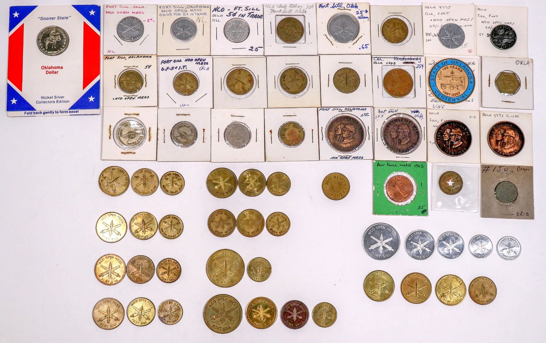 An Oklahoma "Sooner State" nickel silver dollar from Presidential Art Medals; 2007 Oklahoma Centennial of Statehood, enameled medal; 1963 Oklahoma Air Force medal. Tokens from Clinton-Sheridan AFB; Fort Bliss (6) and Fort Sill (51 tokens).