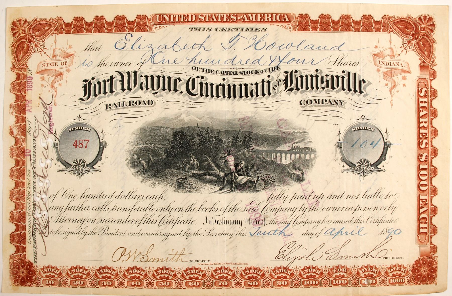 104 Shares of Fort Wayne , Cincinnati and Louisville Railroad Company. Certificate number 487. Dated April 10, 1890. Ken Prag Collection City: State: Date: HWAC# 75823