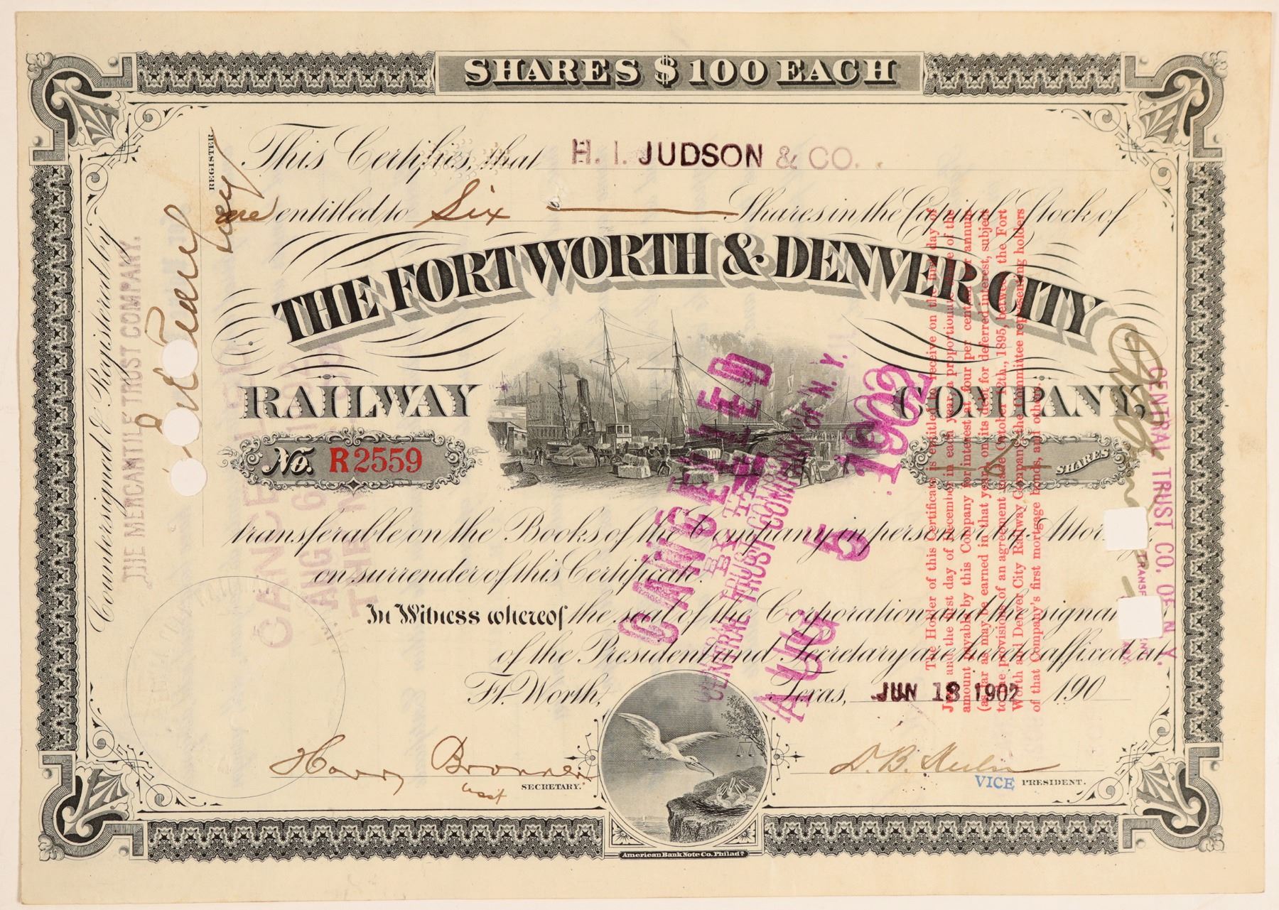 Stock Certificate from the Fort Worth & Denver City Railway Co. Certificate number R2559 issued in 1902 to H. I. Judson & Co. Signed by D. B. Sulin(?) and Harry Bronnen(?). Printed by American Bank Note Co., size 9.5 by 7 inches. In average condition. Canceled. Vignette of maritime in center of photo. Smaller vignette of bird on the bottom. The hole punches on the left side and two square hole punches on the right side. Started construction in 1881 with Grenville M. Dodge behind the project. By 1887, it had reached Amarillo. In 1888, it connected with the Denver & New Orleans Railroad in Union Park, which completed its service to Denver.