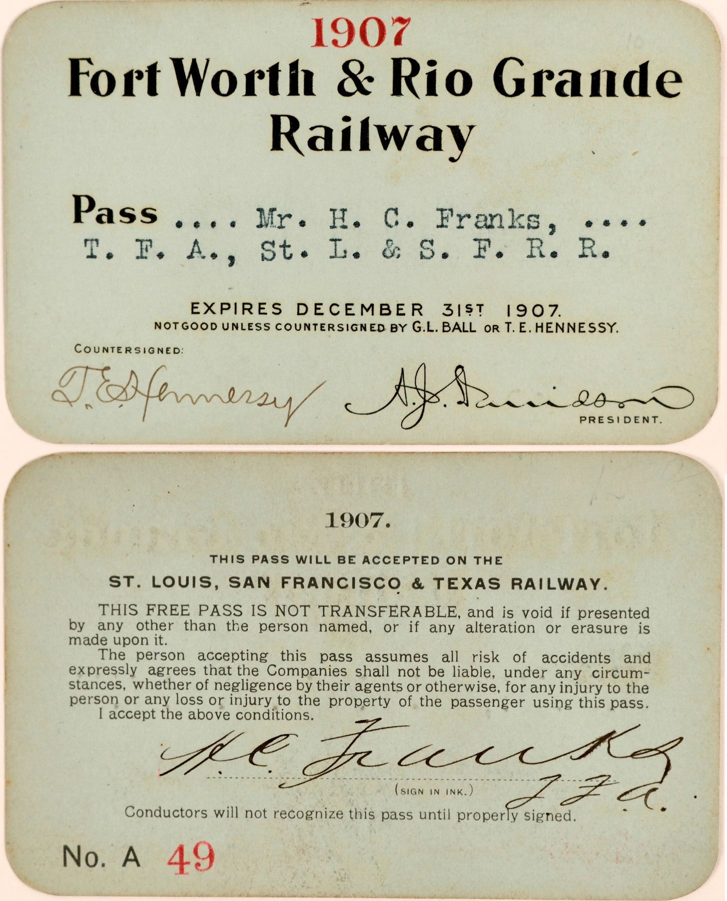 Issued to Mr. HC Franks, TFA for St. Louis & San Francisco Railroad. Printed signature of the president. Countersigned by Hennessy. Endorsed by Franks. "This Pass Will Be Accepted on the St. Louis, San Francisco & Texas Railway" printed on reverse. Black and red print on light blue cardstock. Minor wear.