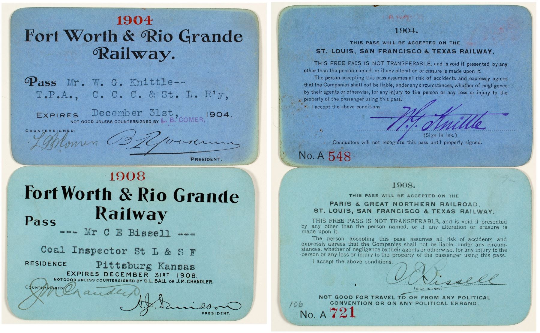 Lot of two. Included: 1) 1904 to W.G. Knittle, countersigned by L.B. Comer. Endorsed by Knittle. Printed on blue cardstock with some toning. 2) 1908 to C.E. Bissell (Coal Inspector St. L. & S.F.). Countersigned by J.M. Chandler. Printed on light blue cardstock with some wear. (Prag Collection) State: Texas City: HWAC#: 39450 Date: