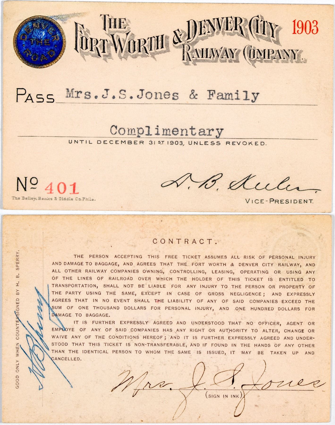 Nice color graphics. Texas and Colorado. "The Denver Road." Pass no. 401, issued for 1903 to Mrs. JS Jones & Family. Printed signature of vice president AB Keeler. Countersigned by HB Sperry. Endorsed by Jones. Black print on tan paper with gold & blue circular logo. Some soiling. Started construction in 1881 with Grenville M. Dodge behind the project. By 1887, it had reached Amarillo. In 1888, it connected with the Denver & New Orleans Railroad in Union Park, which completed its service to Denver.