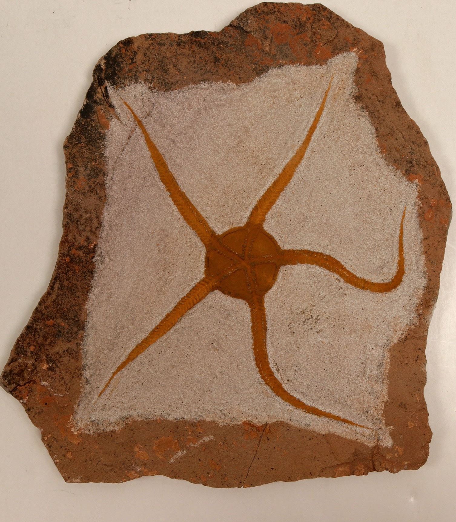 Brittle Stars are in the phylum Echinodermata in the class Ophiuroidea, and they are distinct from but closely related to the more familiar starfish. This fossil is likely from the Ordovician geologic era approximately 500 million years ago. The specimen has been painstakingly revealed by carefully sand-blasting away the sediment matrix and then applying a thin coat of white paint to add contrast to the fossil which has been painted in brownish-yellow. The approximately 9-inch-square slab is beautifully prepared for display and ready to be presented on a small easel or mounted in a shadow box frame.