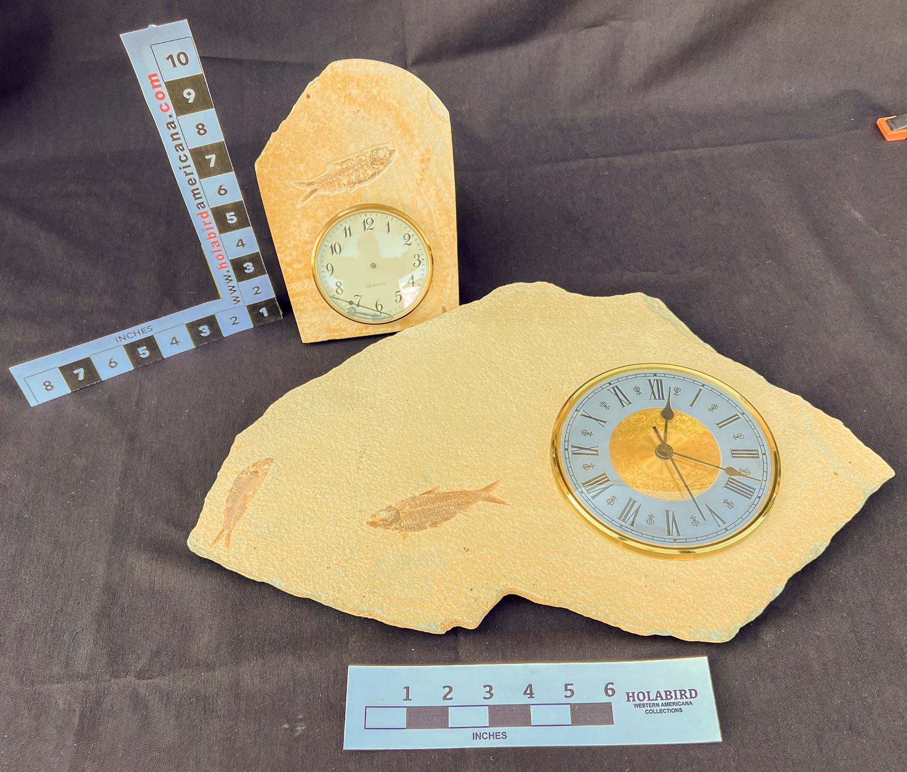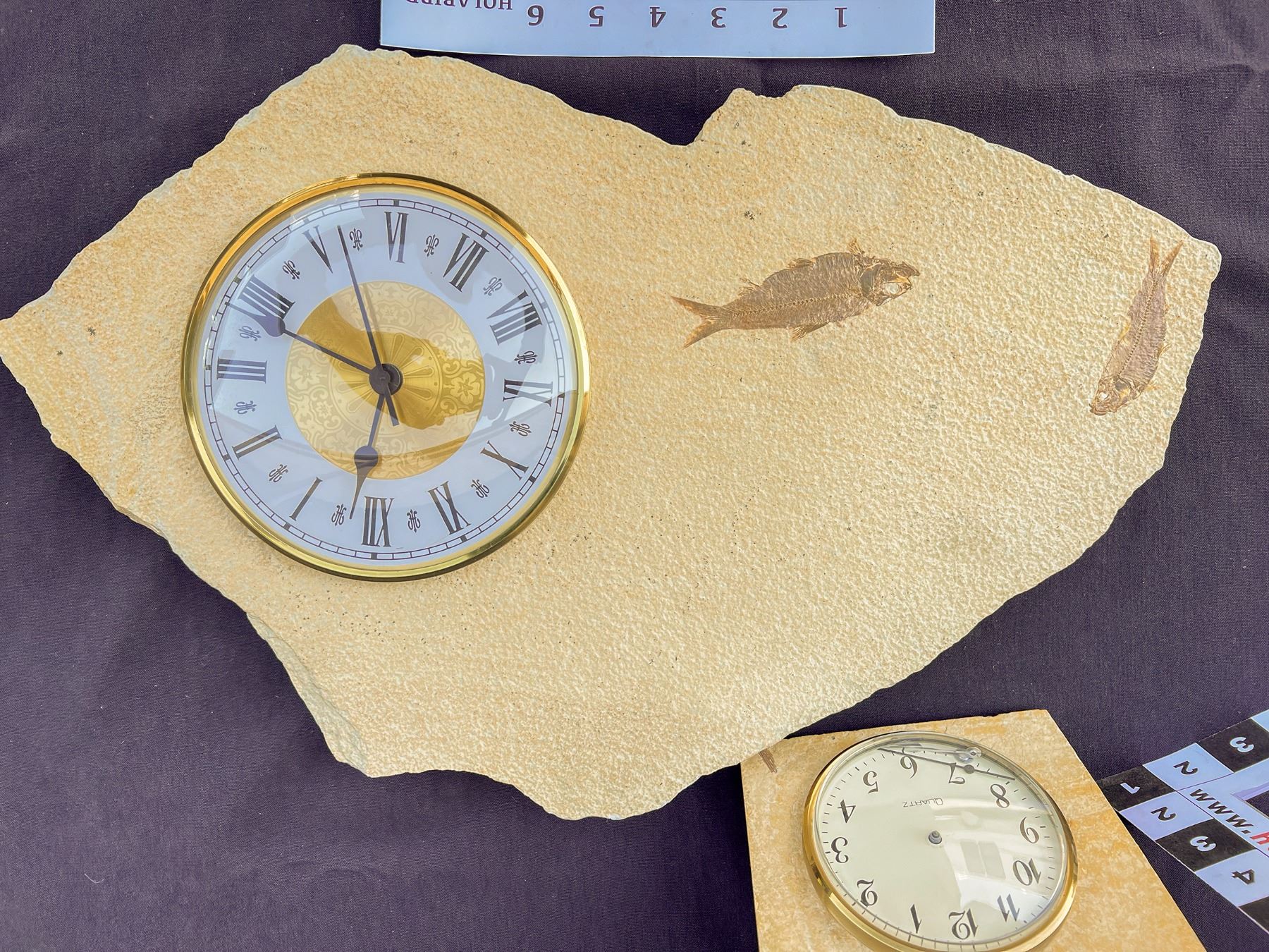 Two clocks, each mounted on a fossilized fish plate. Largest has two fish with the clock, about19 x 12 inches; smaller has one fish with the clock, and the hands have fallen off the clock mechanism into the cover glass. Easy repair. 6 x 9 inches. See photo for fishy details. China Chunlin Zhu Collection