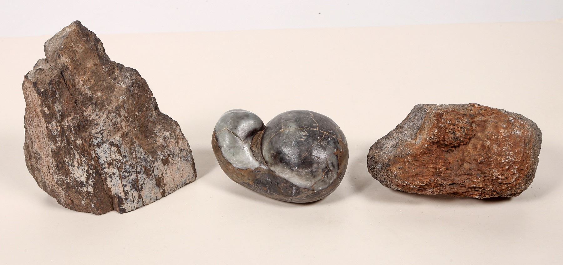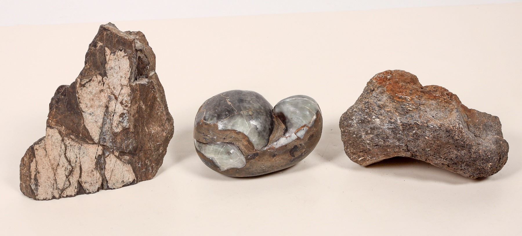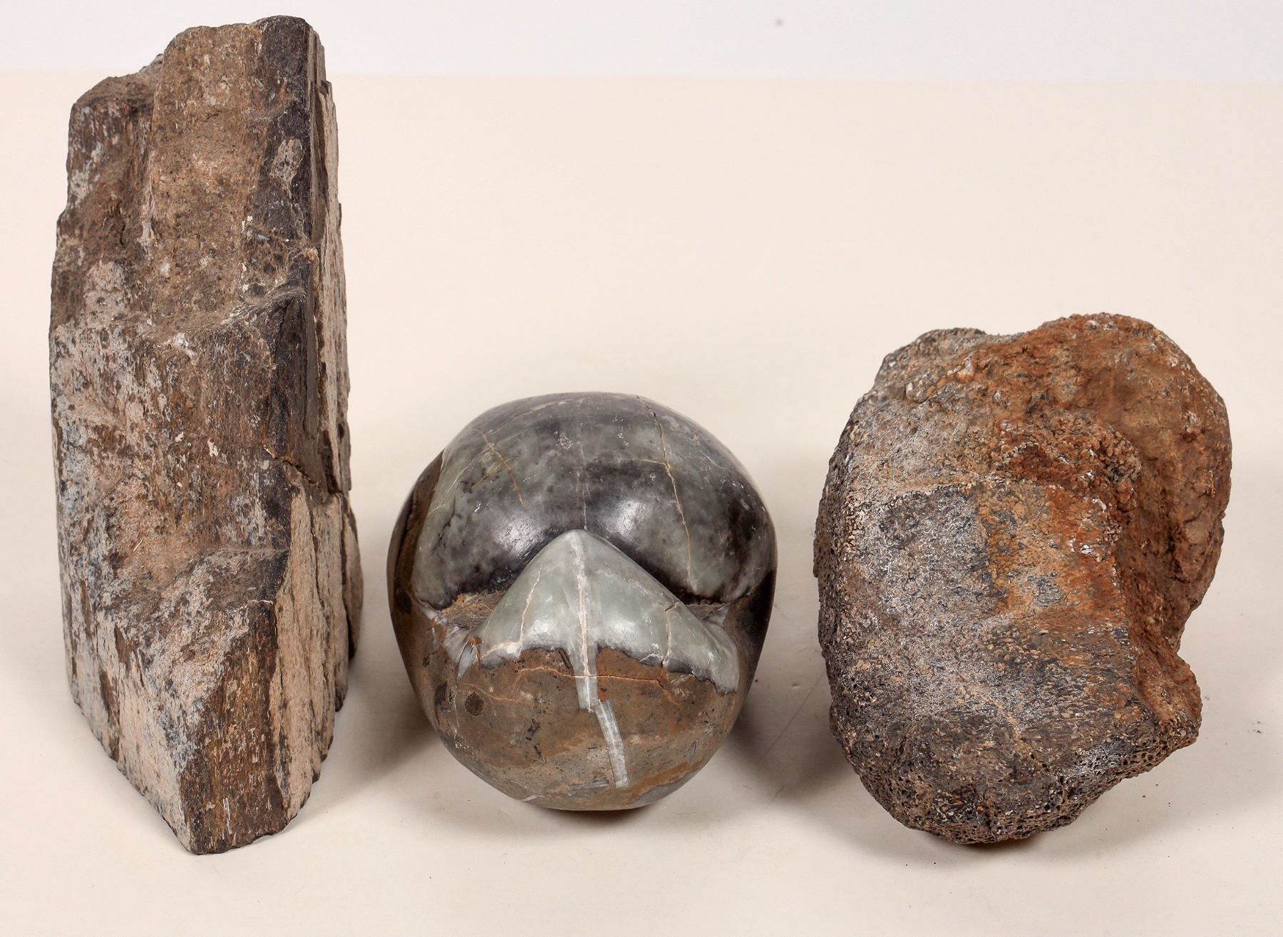 A trio of fossils that includes dinosaur bones (2) and a large polished brachiopod, from China. Species are unknown. Dinosaur bones includes one with a cut surface, approximately 6" x 5" x 2"; and one 5.5" x 3" x 2". Brachiopod is approximately 4" x 3" x 2".