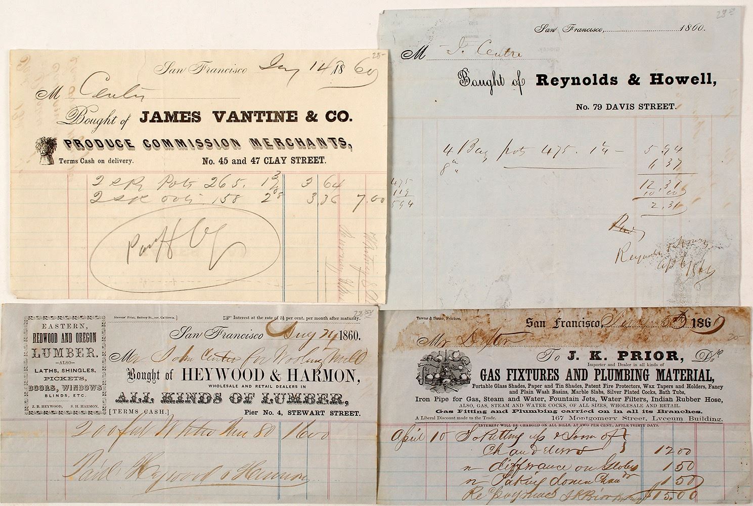 1) Reynolds & Howell of 79 Davis Street. Produce commissioners according to the 860 San Francisco Directory. 2) JK Prior, gas fixture and plumbing. And like most early billheads almost anything else you can think of. For Mr. Dexter. 3) James Vantine, also a produce commission merchant. 4) Hewood & Harmon lumber dealers. (Al Adams Gold Rush Memorabilia Collection) Date: 1861 Location: San Francisco, California HWAC# 57357