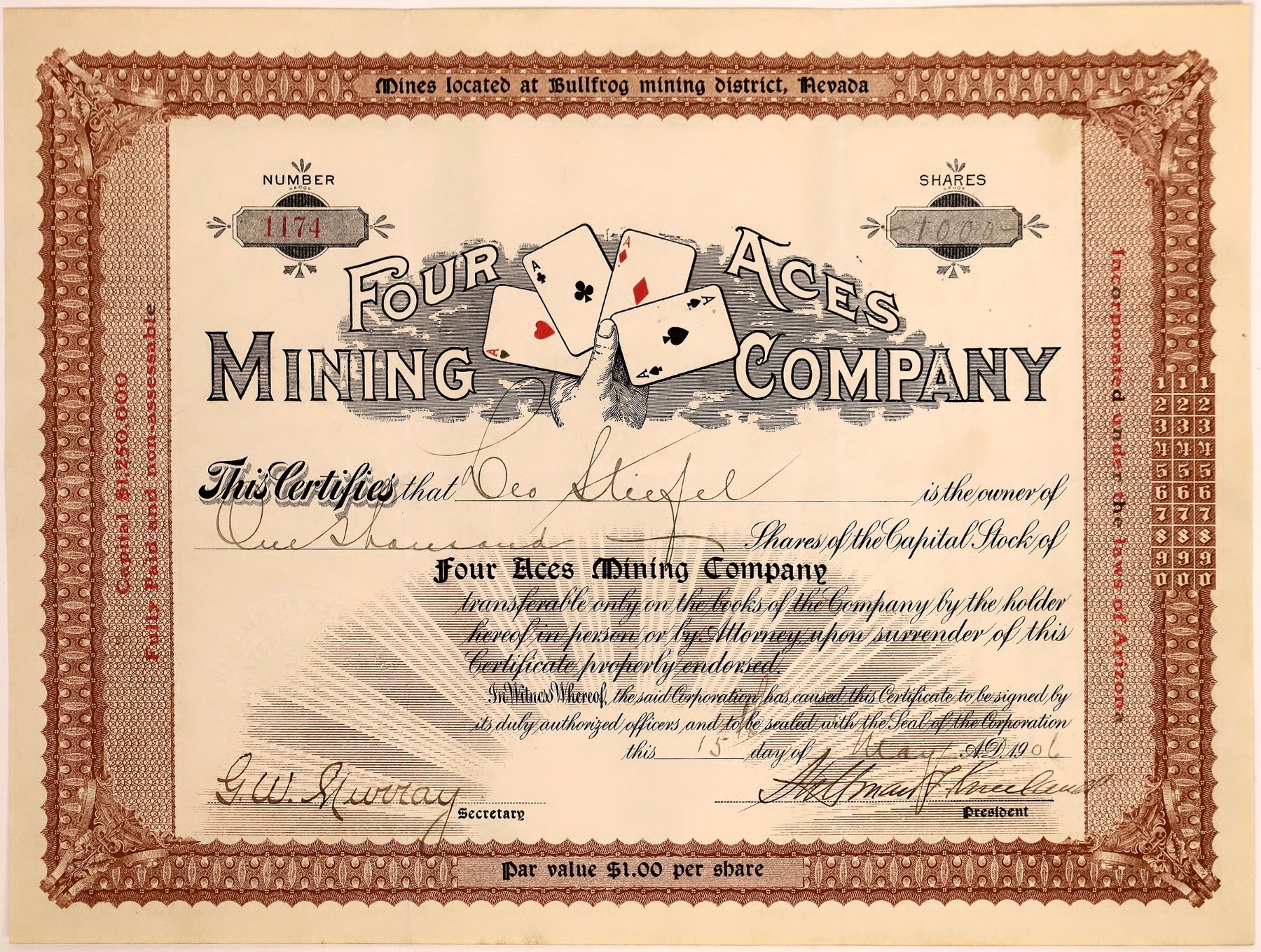 This is one of Nevada's most collectable stock certificate. Iconic vignette of hand holding four aces in the gambling state. Mines located at in Pioneer, Bullfrog Mining District, Nevada. Number 2275 issued in 1906 for 1,000 shares to Leo Stiefel. Signed by secretary G. W. Murray and president Stillman F. Kneeland: Union officer, Advocate General, Vermont Supreme Court Justice. Not cancelled. Not common. Two pin holes. No edge, corner or discoloration issues. Included is a biography on Kneeland, one page of notes on the Four Aces MC, and a short description of Pioneer.