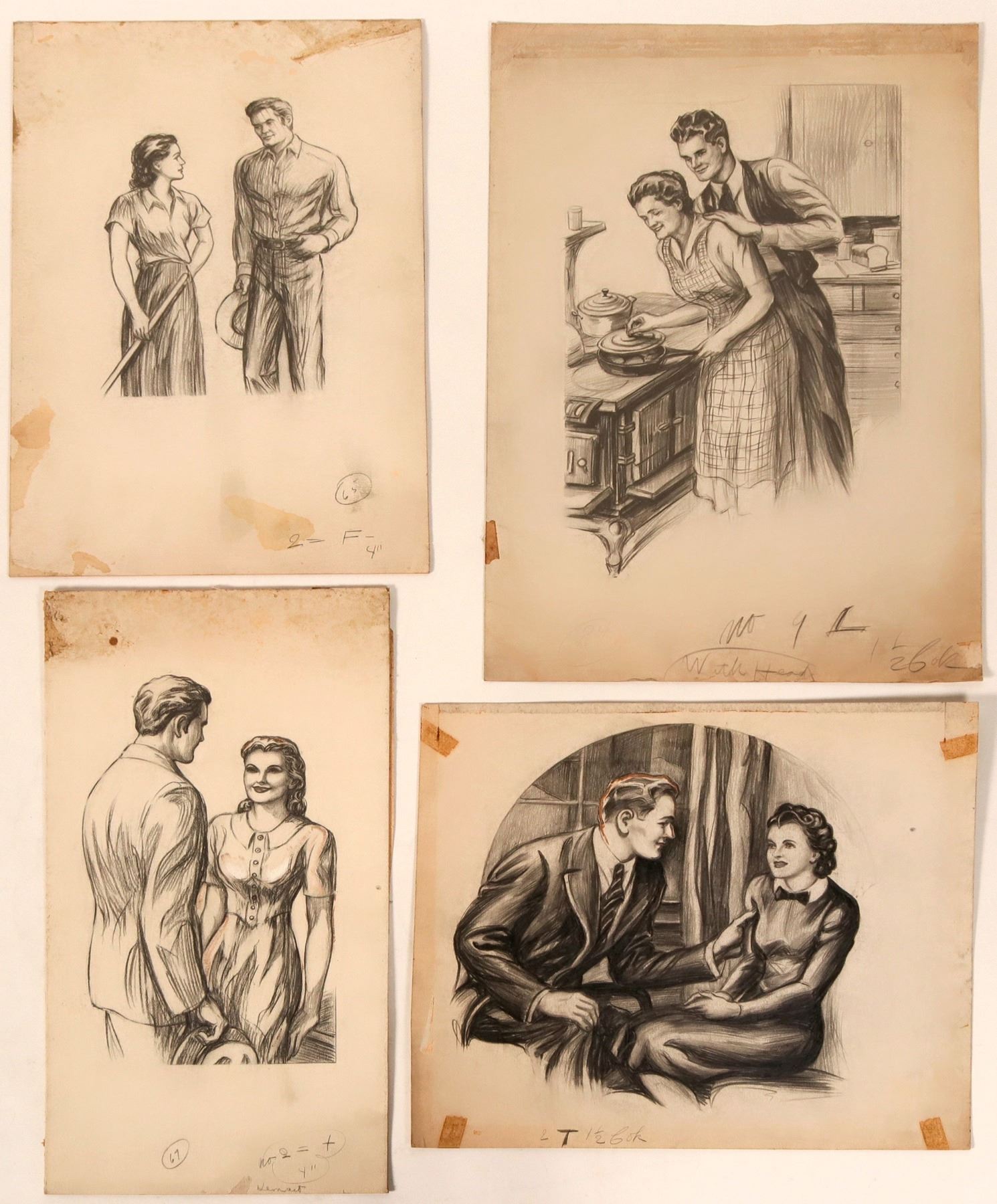 Four more pencil illustrations. 1) Man in suit and tie grasping woman's arm--she looks dreamy, 10.5" x 9.5", 2) Cowboy with woman who is holding a broom, 8.25" x 6.25". 3) Man facing smiling woman, 10.5" x 6". 4) Man bending over woman who is cooking, 12" x 8". State: City: Date: c1930's-40's