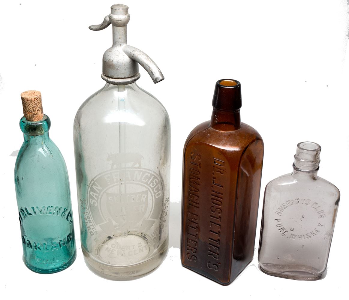 San Francisco Seltzer Water Co. Bottled by New Century Bev. Co., quart bottle.; Dr. J. Hostetter's Stomach Bitters (brown bottle); J. I. Blivens & Co., Oakland, California, corked aqua bottle; American Club Pure Whiskey, pint bottle.