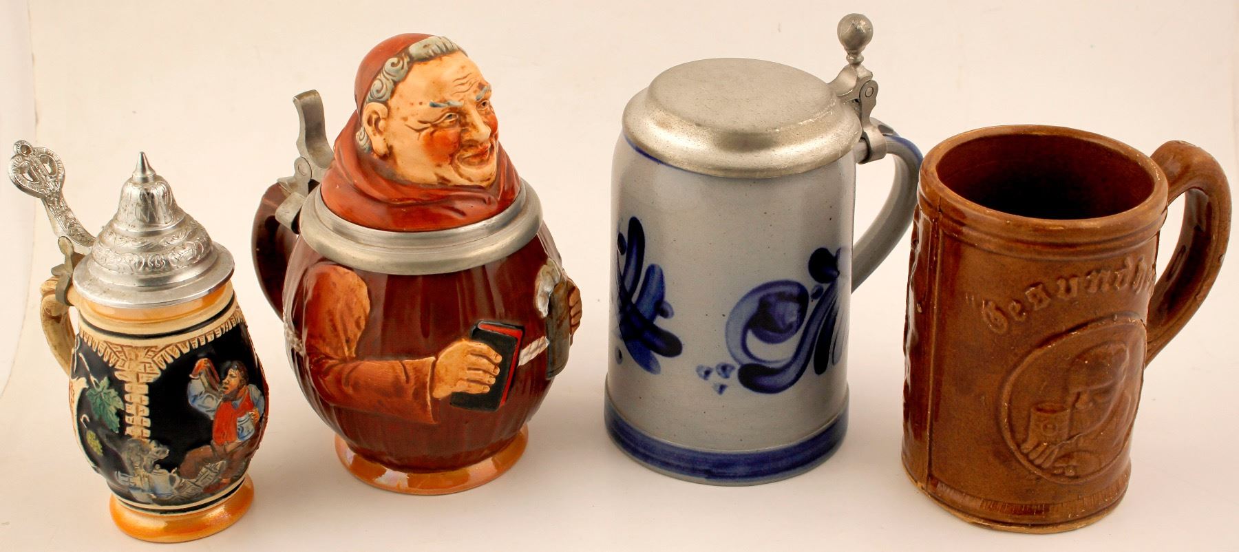 Four steins: 1) Half liter shaped like a monk, short and stubby, "Made in Germany" on the bottom; 2) brown glazed open top beer mug; 3) blue glaze on silver pottery with pewter top, no makers; 4) small stein, pewter top, very ornate, classic tourist small stein. Date: City: State: HWAC# 76366