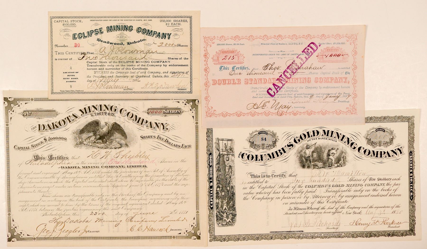 Lot of 4 different. Includes: The Eclipse Mining Co. of Deadwood, Dakota (issued 1886, not cancelled, Mines in Ruby Basin, folds and spindle hole); Double Standard Mining Co. (issued 1889, stamp cxl, Lead City, folds); The Dakota Mining Company, Limited (issued 1881, not cxl, eagle vignette, folds); and The Columbus Gold Mining Co. of the Black Hills (issued 1880, not cxl, mining vignettes, folds). Nice group! () Ken Prag Collection