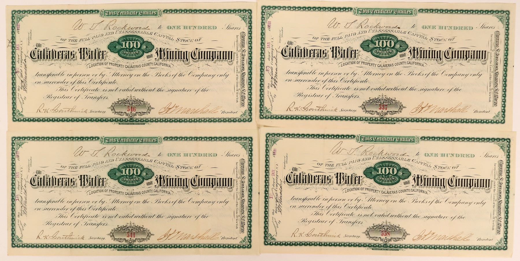 Lot of 4 issued in 1881 to W. Rockwood. Signed by President Marshall and Secretary Southwick. Not cancelled. Green border, black print. Folds, pinholes.