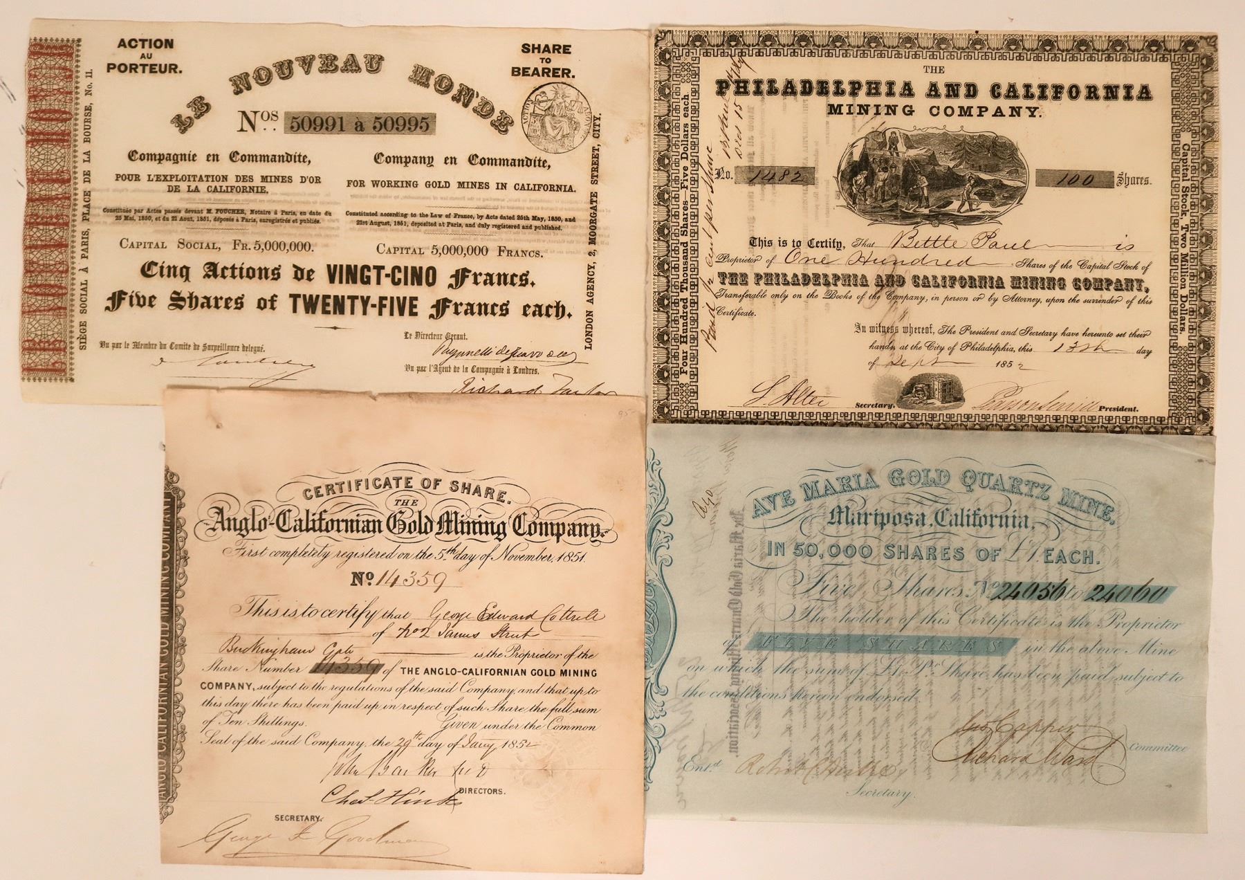 Four California Gold Rush era stock certificates includes a Le Nouveau Monde stock certificate. Issued in Paris in 1850-51 for shares of working gold mines in California. Also included is an Ave Maria Gold Quartz Mine certificate, from Mariposa, Cal., for five shares, signed by committee members and secretary. Not dated or canceled. Clean. Very rare. According to the company's description detailed on the reverse, a London-based association held half the rights to the Ave Maria Gold Quartz Mine in the Mariposa District, California which would be worked under a lease with the owner of the other half. The Ave Maria was mentioned in a letter written from John Duncan to John Fremont on December 26, 1851. Plus one certificate from the Anglo-Californian Gold Mining Company, signed by two directors and a secretary, issued in 1852. Last is a Philadelphia and California Mining Company certificate, No. 1482, 100 shares issued to Bettle Paul in 1852. Signed by the president and secretary. Not canceled. See photo for further details.