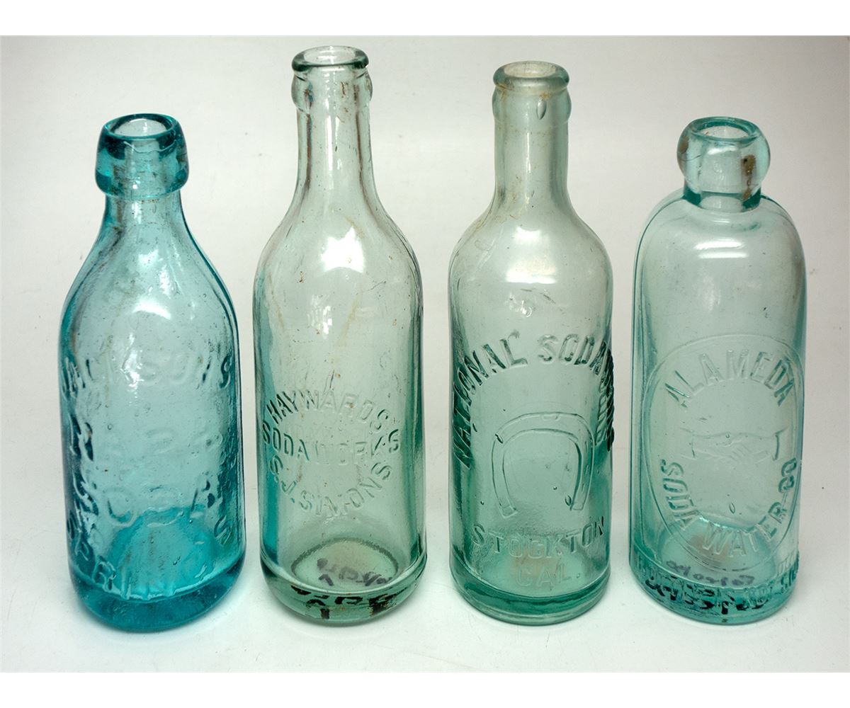 Best of group: blob topped 1890 Hutchinson bottle from Alameda--shows two hands shaking hands. Also blob topped, 1880 Jackson Springs Napa Soda (natural mineral water); crown top, c. 1908, Stockton, National Soda; Works; crown top, cl. 1908, Haywards Sodaworks S. J. Simons.