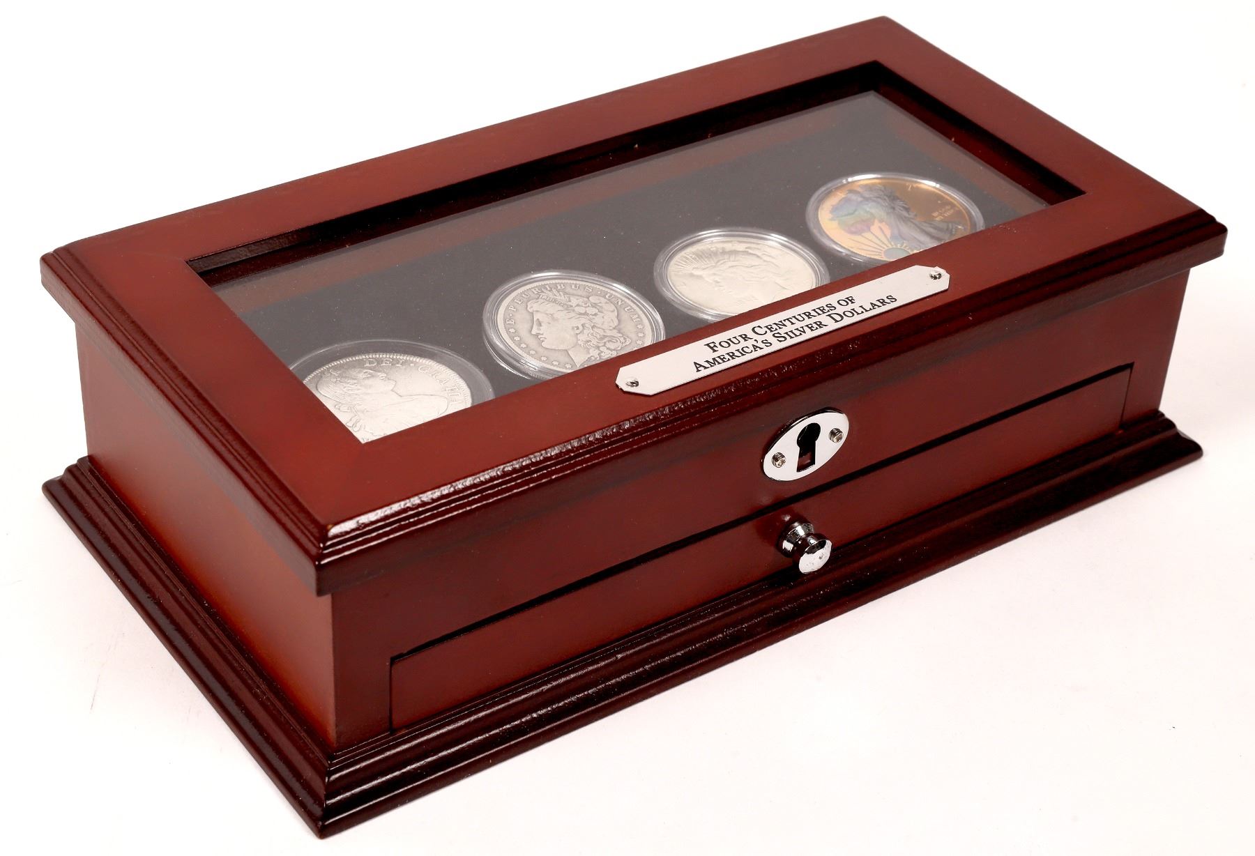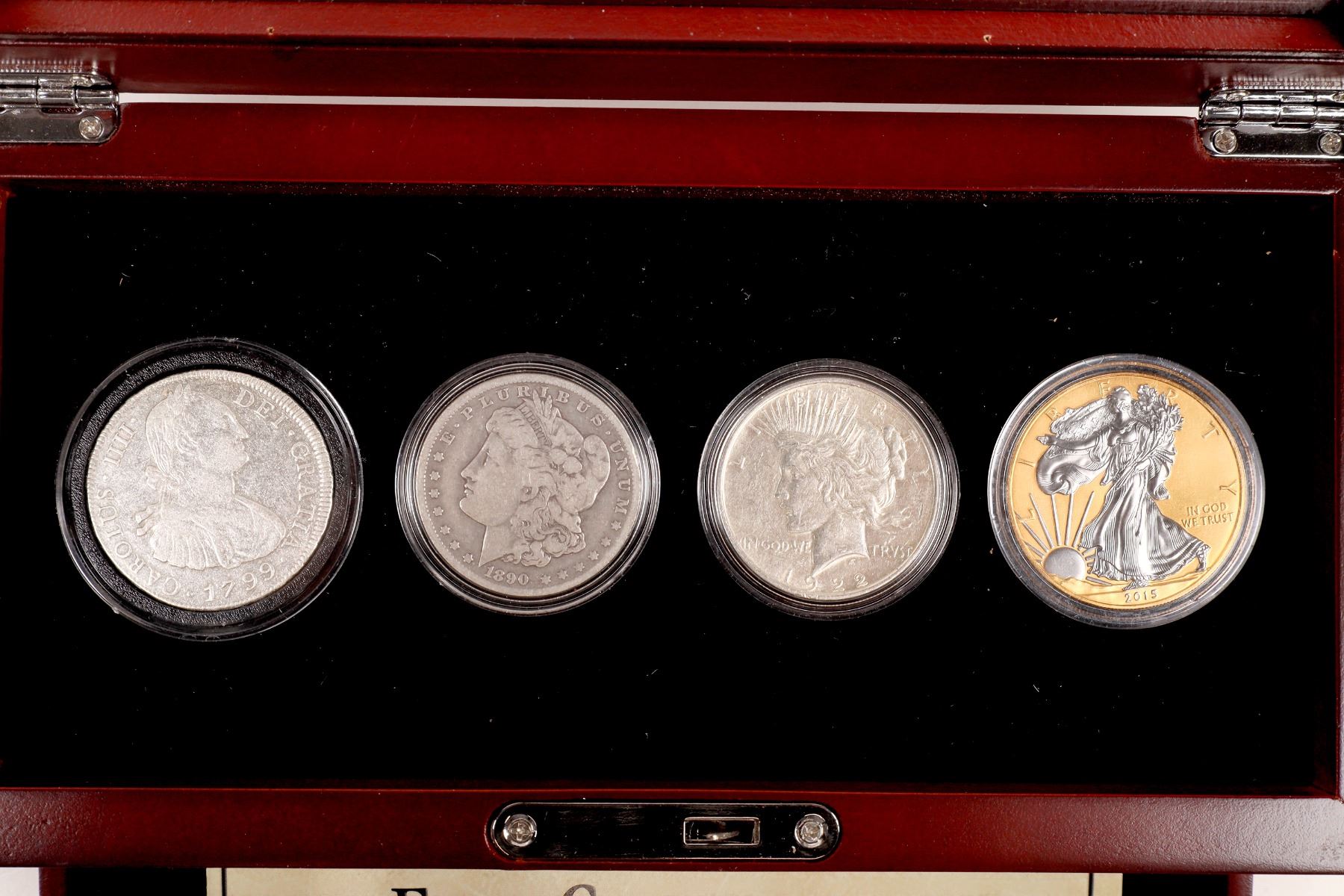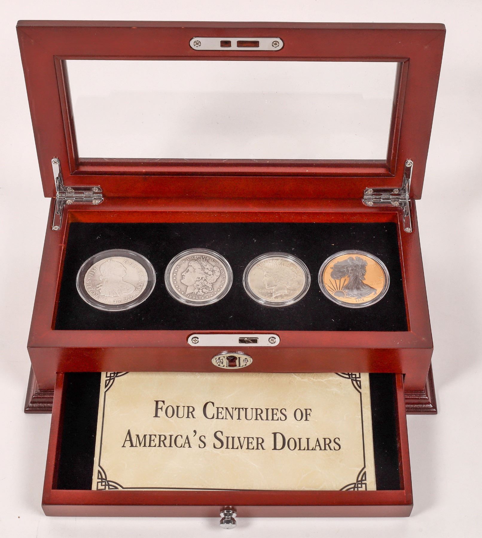 Issued by PCS Stamps and Coins: Four Centuries of America's Silver Dollars. Glass topped wooden case (10 x 5 x 3 inches): four coins: 1799 Eight Reales "Portrait Dollar"; 1890-O Morgan dollar; 1922 Peace dollar; 2015 silver eagle. Drawer with information booklet.
