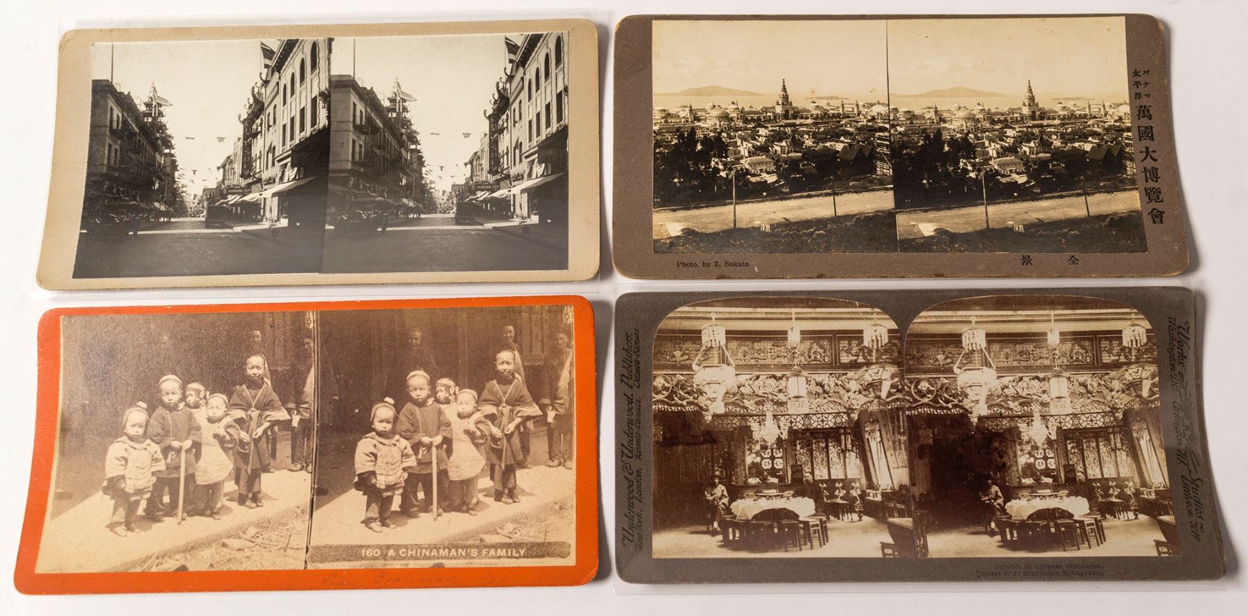 Lot of 4 different. 1) Best is an 1897 card titled "A Chinaman's Family." Stamped M.F. McNeil (not listed in Mautz) and handwritten date Jan. 28, 1897. Fornt of card has handwritten San Francisco, Cal. at bottom. View shows five Chinese children with others in the background. Nice condition. 2) Underwood & Underwood stereoview "Interior of Chinese restaurant. Stains. 3) c.1930s stereoview of Grant Ave. in Chinatown (identified on reverse, no photographer listed). Nice condition. 4) Birds-eye of San Francisco with Chinese characters along the right side. Photo by Z. Sakata. (1915 or earlier according to Mautz). (Prag Collection) Date: Location: San Francisco, California HWAC # 50666