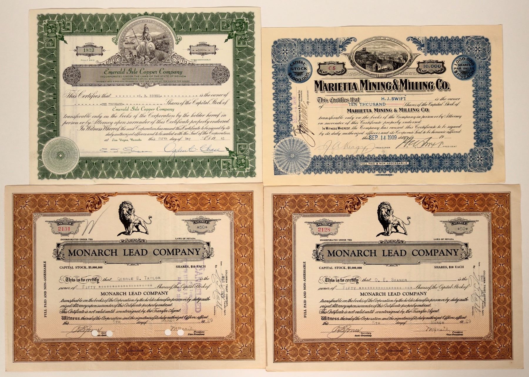 Lot of 4. Included: Monarch Lead Company (two stocks issued in 1929, lion vignette); Emerald Isle Copper Company (1941, state seal vignette); and Marietta Mining & Milling Company (1909, mining vignette). Good condition.