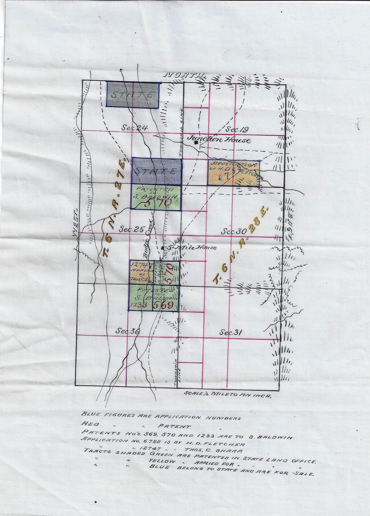 c1890. Fletcher lies where the roads to Bodie, Aurora, Carson City, and Hawthorne meet. Names on map include Henry D Fletcher (active in public affairs, his name was given to the area and stage stop), Thomas C Sharp (foreman on the Defiance Mine in Bodie, worked on Mono Lake Railroad), and Schnedicker Baldwin (rancher). Has folds, but a fabulous and colorful piece of history. State: Nevada City: Fletch, Nevada Date: HWAC# 99409