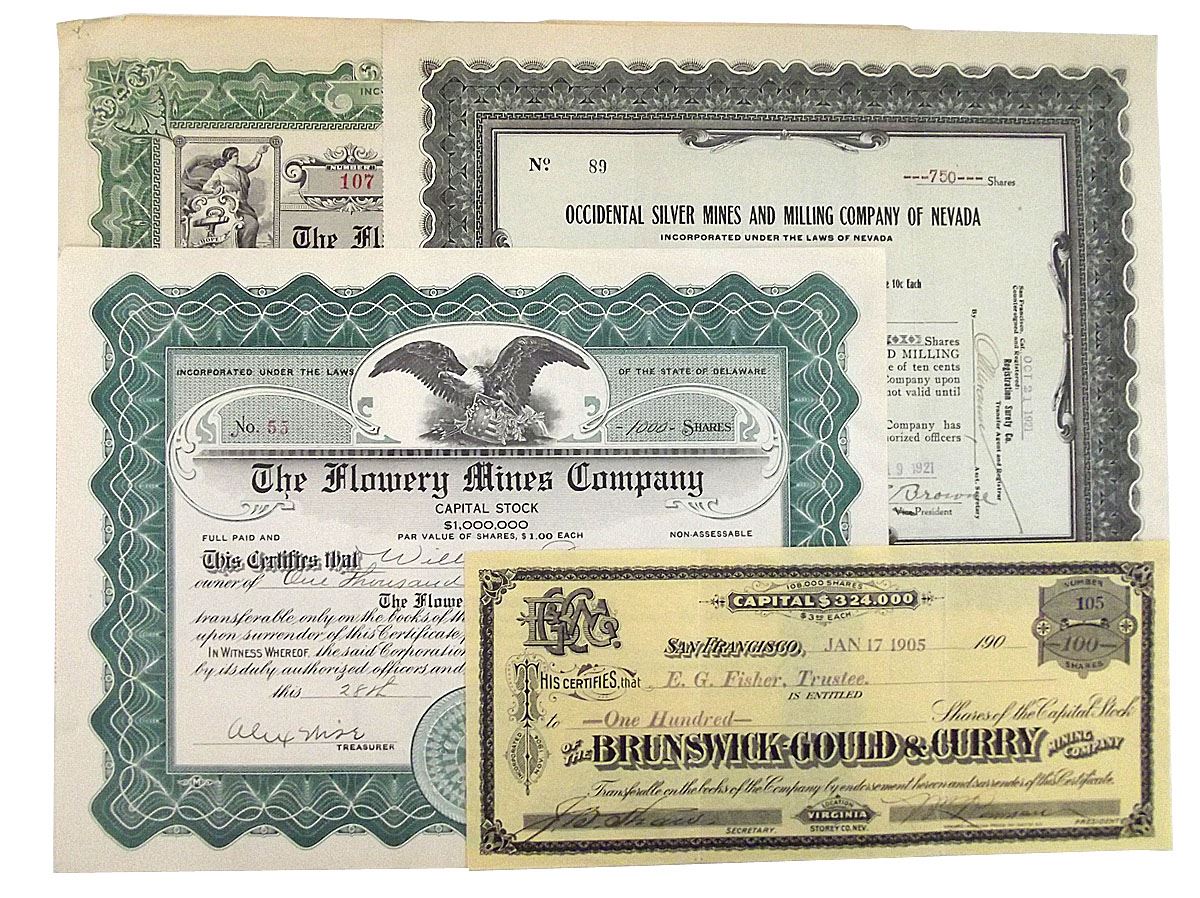 One Brunswick-Gould & Curry. Issued to EG Fisher, trustee, for 100 shares, certificate number 105, in 1905. The Flowery Mines (2) issued in 1924 and 1929. Occidental Silver mines. Certificate 89 issued to Charles Olney for 750 shares in 1921. The Olney name was long associated with the Comstock Mines.