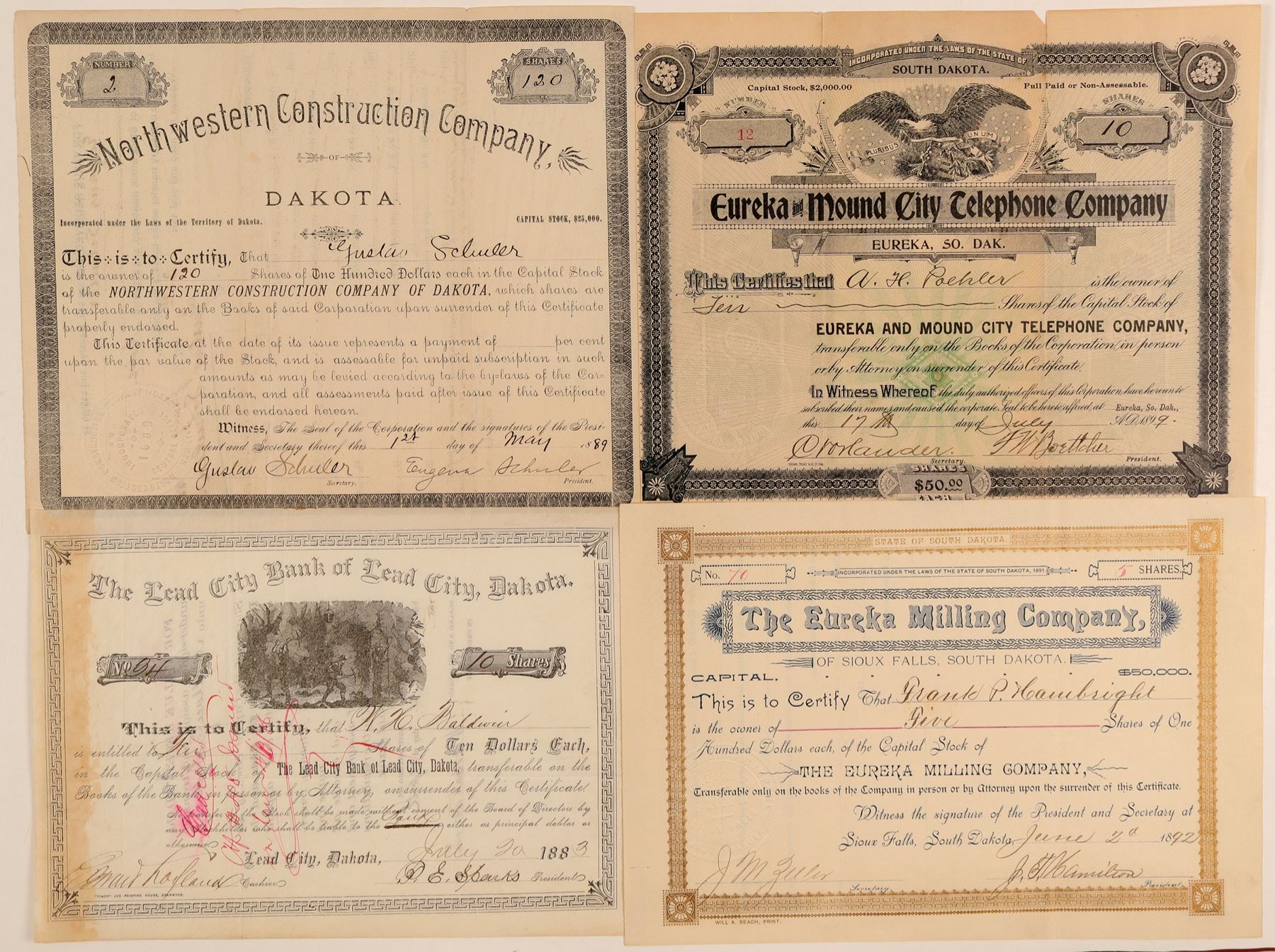 Lot of 4 different. 1) The Lead City Bank of Lead City, Dakota. Stock No. 34, issued in 1883 for 10 shares to Baldwin. Signed by president Sparks and the cashier. Pen cancelled. Mining vignette. 2) Northwestern Construction Company of Dakota. Stock number 2, issued in 1889 to the company secretary. Also signed by president Schuler. Not cancelled. 3) The Eureka Milling Company of Sioux Falls, South Dakota. No. 70, issued for 5 shares in 1892. Signed by president Hamilton and the secretary. Not cancelled. Gilt border, blue print. 4) Eureka and Mound City Telephone Company. Eureka, SD. No. 12 issued in 1899. Not cancelled. Black border and eagle vignette. Good condition overall, with folds and some separation. Please inspect. Ken Prag Collection
