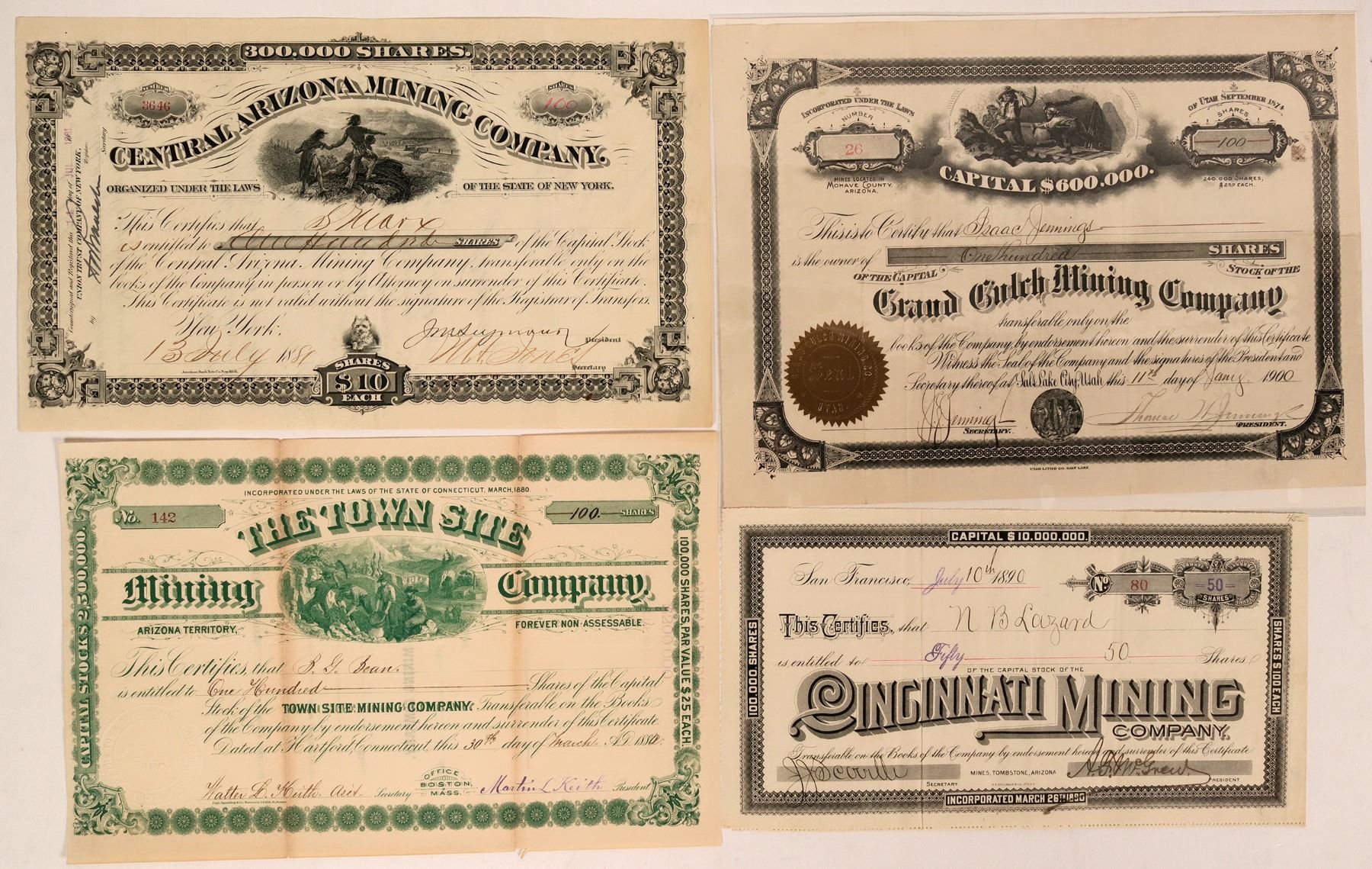 Lot of 4. 1) The Town Site Mining Company. Extra rare. Not in Filer or Holabird indexes. "Arizona Territory" printed to the left of vignette. Inc. in Connecticut, 1880. No. 142, issued for 100 shares to B.G. Bean on March 30th, 1882 in Hartford. 2) Central Arizona Mining Company. No. 3646. Issued for 100 shares to S. Marx on July 13th, 1881. Signed by the president (James Seymour) and secretary (M.A. Jones). Not cancelled. Ornate border and vignette of Native Americana pointing at a locomotive. 3) Grand Gulch Mining Company. Rare. Mines located in Mohave County, Arizona (printed upper left). Inc. in Utah, 1874. No. 26, issued for 100 shares to Isaac Jennings on Jan. 11th, 1900. Signed by president Thomas Jennings and secretary Jennings. 4) Cincinnati Mining Company. "Mines, Tombstone, Arizona" (printed at bottom center). Number 80 for 50 shares to NB Lazard on July 10th, 1890. Signed by AF McGrew (president) and JJ Scoville (secretary).