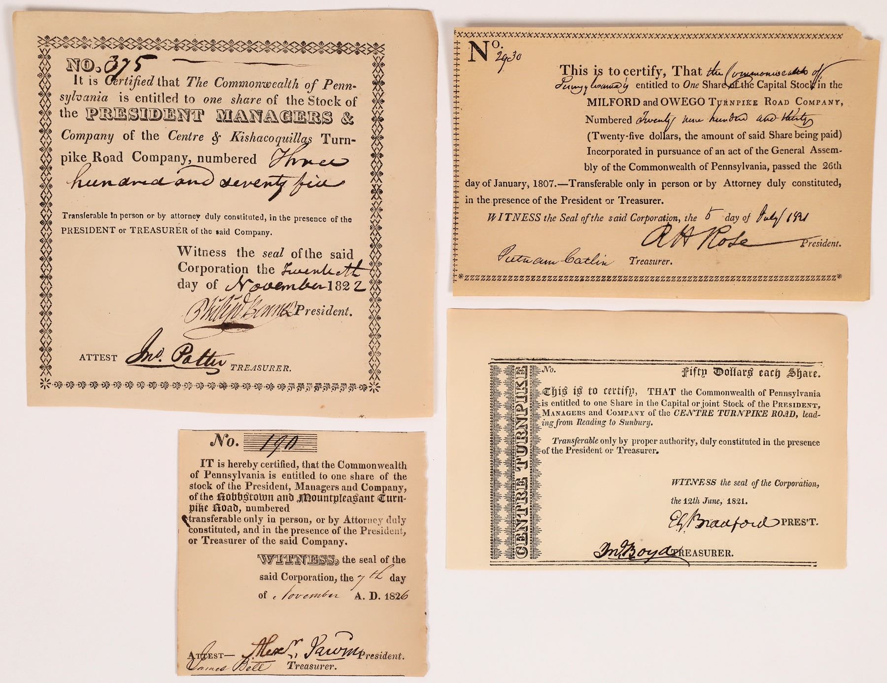 Lot of 4 different. 1) Milford & Oswego Turnpike Road Company. Issued in 1821 for one share to the Commonwealth of Pennsylvania. Signed by president Rose and treasurer Catlin. 4 x 6.25" Inc. in 1807. The road ran from Milford, PA, to Owego, NY, via Willsonville, Palmyra, Dyberry, Canaan, Rix's Gap, and Montrose. According to Wayne County history, "There were eight toll gates on the Milford-Owego Turnpike. Gatekeepers received a 10% commission. The gate near Waymart was one of the most profitable, collecting around $1,000 in 1830. Stage travel on the turnpikes reached its zenith about 1836. Canals and railroads carried freight and passengers at a fraction of the cost and led to a drop in use of the turnpikes after that. They later became part of the public highway system." 2) President Managers & Company of the Centre & Kishacoquillas Turnpike Road Company. Issued for one share in 1822 to the Commonwealth of PA. Signed by president Benner and treasurer Potter. 6 x 6" 3) Robbstown & Mountpleasant Turnpike Road. Issued for one share to the Commonwealth of PA in 1826. Signed by president Irwin and treasurer Ball. 3.75 x 3.5" 4) President, Managers and Company of the Centre Turnpike Road, leading from Reading to Sunbury. Issued for one share to the Commonwealth of PA in 1821. Signed by president Bradford and treasurer Boyd. 4 x 6"