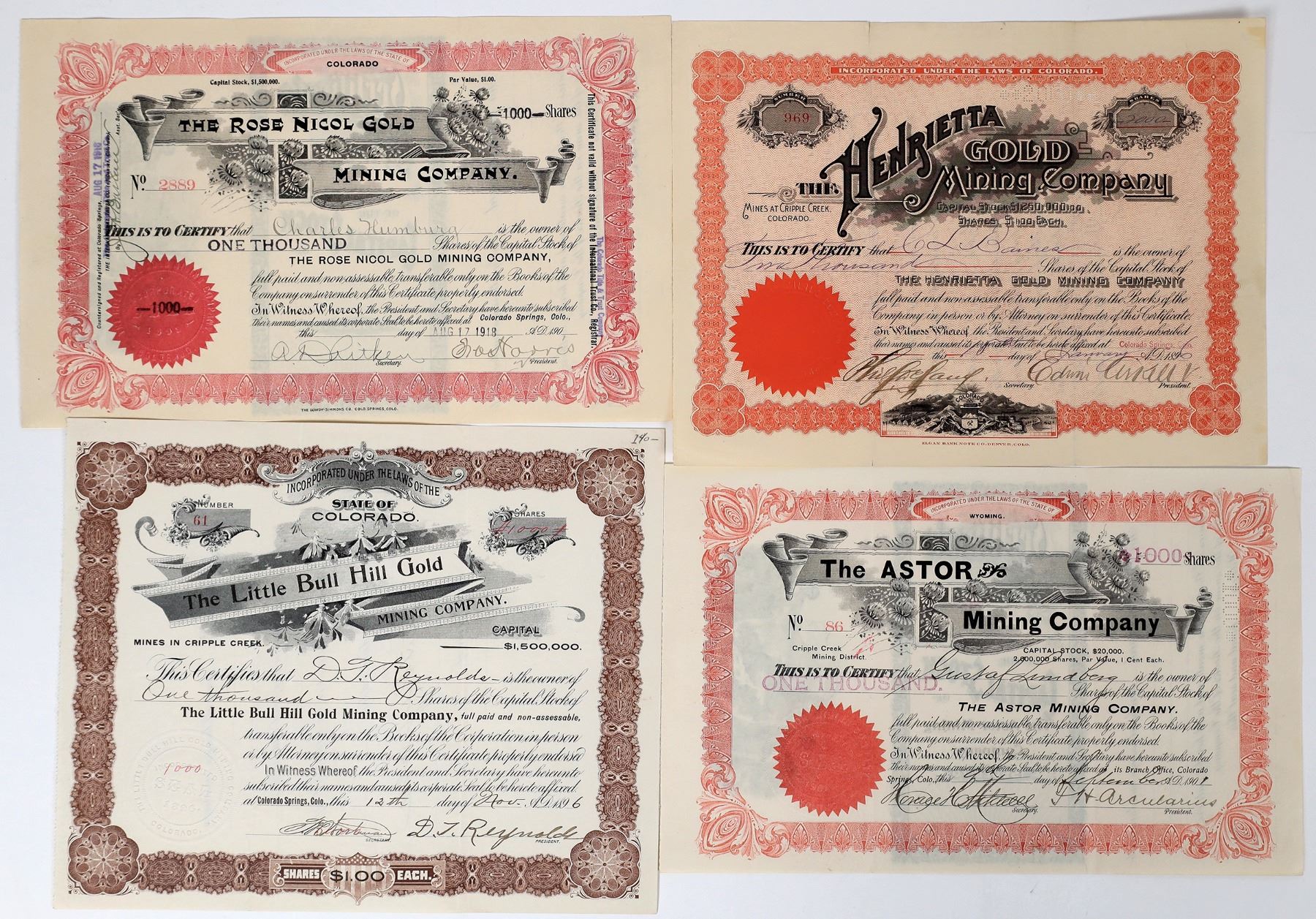 Lot of 4 different. 1) Henrietta Gold Mining Company. Issued in 1896 to CL Baines for 2,000 shares. Inc. in Colorado. Signed by president Edwin (illegible) and secretary Phil. S. Delany. Not cancelled. Orange border, seal, and background. Vignette at bottom incorporating the Colorado state seal on top of mountains and next to mines. "Mines at Cripple Creek, Colorado" printed under logo. 7.5 x 9.75" Printed by Elgan Bank Note Co., Denver. Deep folds. Pinholes. Owns the BH Bryant, Midland ,and Hagerman claims on the north extension of Tenderfoot Hill. A shaft house and gallows frame including one shaft about 65 feet deep, and two or three from 40 to 60 feet. 2) Astor Mining Company. Inc. in Wyoming. No. 86, issued for 1,000 shares to Gustaf Lundberg in 1901. Signed by president Arcularius and secretary Mitchell. Not cancelled. Red border and seal, floral vignettes around title. Folds. 7 x 10.75" 3) Little Bull Hill Gold Mining Company. Inc. in Colorado. No. 61, issued for 1,00 shares to president D. Reynolds in 1896. Signed by Reynolds and the secretary. Not cancelled. Brown border, black print, floral vignettes around title. 8 x 10" Folds. 4) Rose Nicol Gold Mining Company. Inc. in Colorado. No. 2889, issued for 1,000 shares to Charles Humburg in 1918. Signed by the vice president and secretary. Not cancelled. Red border and seal, floral vignettes around title. Folds. 7 x 10.75"