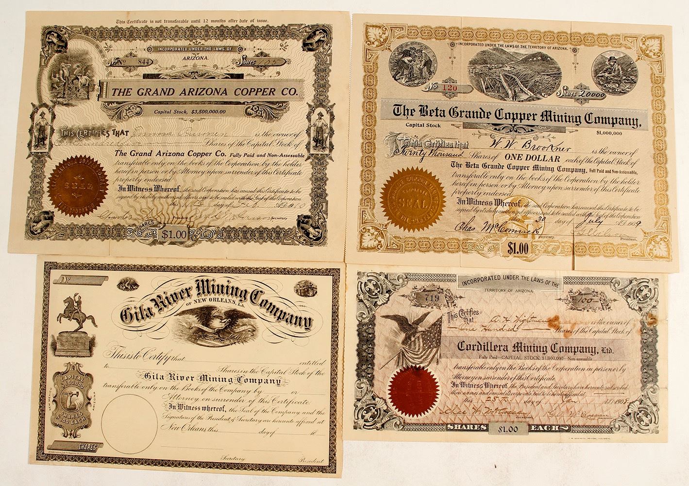 1) Unissued Gila River Mining Company of New Orleans. Excellent condition. Mayflower District. c1860. Page 89 in Garbani. One page description is included. 2) Grand Arizona Copper Company. 1910. Ash Springs District. Ash Springs is now a ghost town. 3) Cordillera Mining Company. 1908. Page 88 in Garbani. 4) Beta Grande Copper Mining Company. 20,00 shares in 1909 to WW Brookner. San Carlos District. W. W. Brookner built a two-story building on Broad Street and opened it as a large general merchandise store in 1910 in Globe. It was constructed in the Modern Commercial style. Mr. Brookner leased the building to various businesses during his term as the Gila County Treasurer. (Laguna Collection) HWAC# 62950 Date: Location: Graham, Arizona