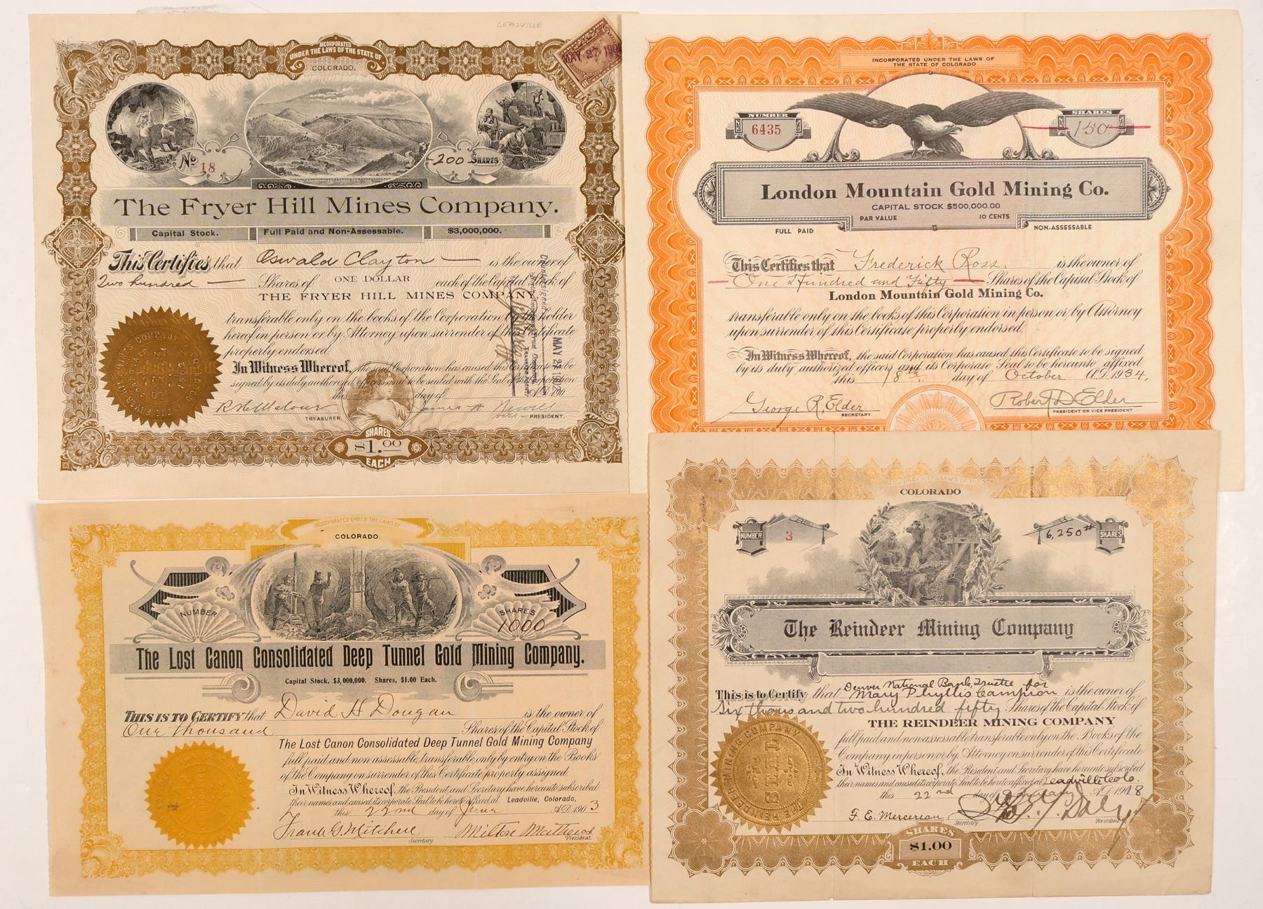 Lot of 4 different. 1) The Fryer Hill Mines Company. Issued in 1902, not cancelled. Gold border and three mining vignettes. Pinholes, folds. 2) The Lost Canon Cons. Deep Tunnel Gold Mining Company. Issued in 1903, not cancelled. Yellow border and mining vignette. Heavy folds, glue residue on reverse corners. 3) The Reindeer Mining Company. Low number 3, issued in 1918. Not cancelled. Brown border, mining vignette. Pinholes, folds, tape repairs. 4) London Mountain Gold Mining Company. Issued in 1934, not cancelled. Orange border and eagle vignette. Heavy folds. Ken Prag Collection
