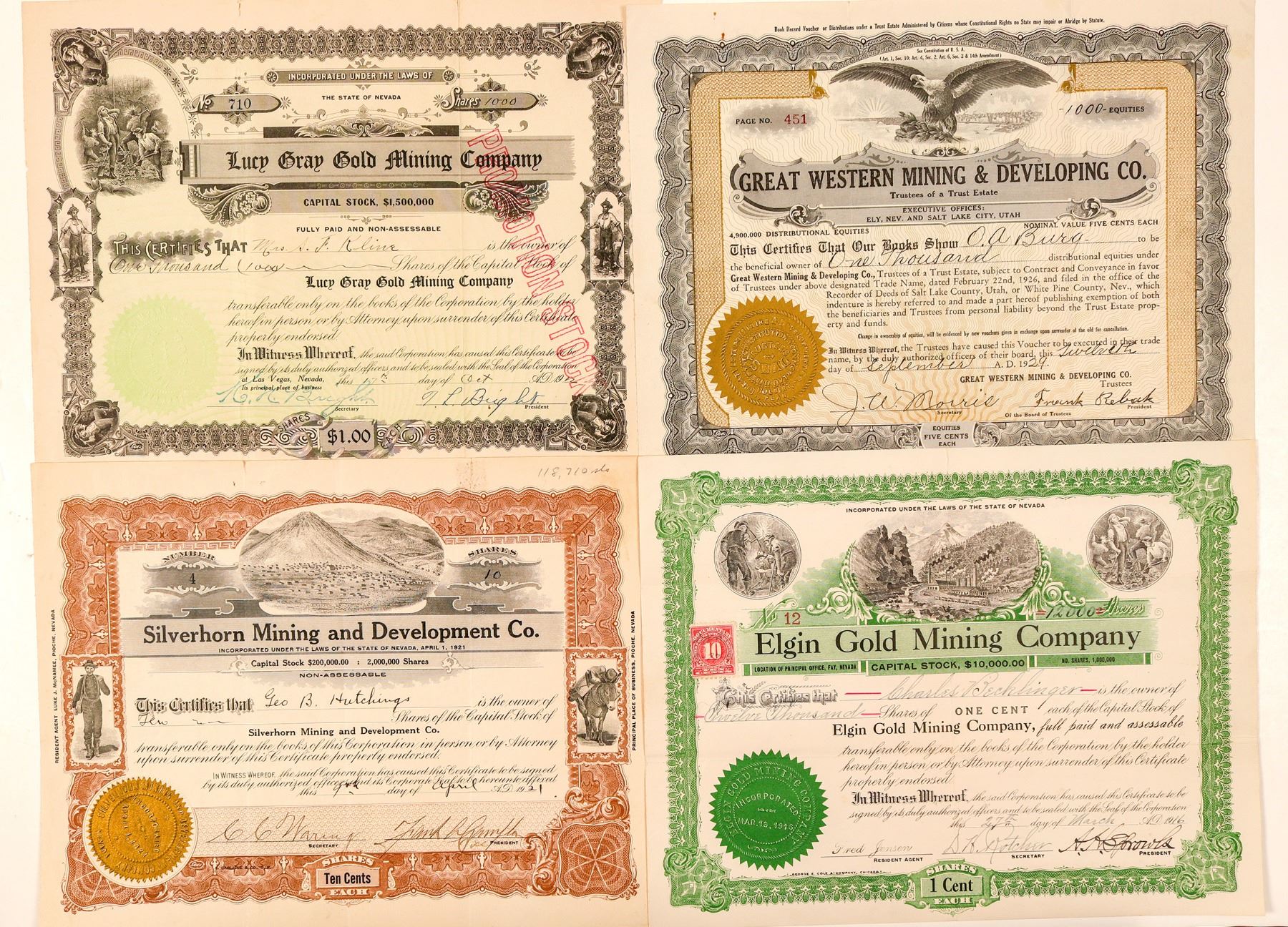 Lot of 4. 1) Lucy Gray Gold Mining Company. Lyons. Issued in 1912 for 1,000 shares. Multiple mining vignettes. Folds with separation. 2) Great Western Mining & Developing Company. Cave Valley District. Issued for 1,000 shares in 1929. Not cxl. Eagle vignette. Folds. 3) Silverhorn Mining and Development Co. Silverhorn. No. 4, issued in 1921. Not cancelled. Multiple mining vignettes. Staple holes, folds, tape repairs, toning. 4) Elgin Gold Mining Company. Fay. Issued in 1916 for 12,000 shares. Not cxl. Multiple mining vignettes. Folds. Ken Prag Collection
