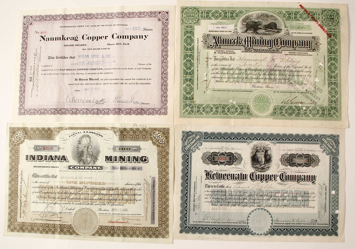 1) Naumkeag Copper Company. Issued 1914 for 100 shares to Wrenn Bros. Not cancelled. 2) Indiana Mining Company. Issued 1925 for 100 shares to Estabrook & Co. Native American vignette. Both the president and secretary signatures have been crossed out and resigned by different people. 3) Ahmeek Mining Company of Michigan. Issued for 20 shares in 1917. Stamped and punch cancelled. Beaver vignette. 4) Keweenaw Copper Company. Issued in 1906 for 50 shares. Not cancelled. Allegorical vignette. (Prag Collection) Date: 1906-1925 Location: Michigan HWAC# 55428