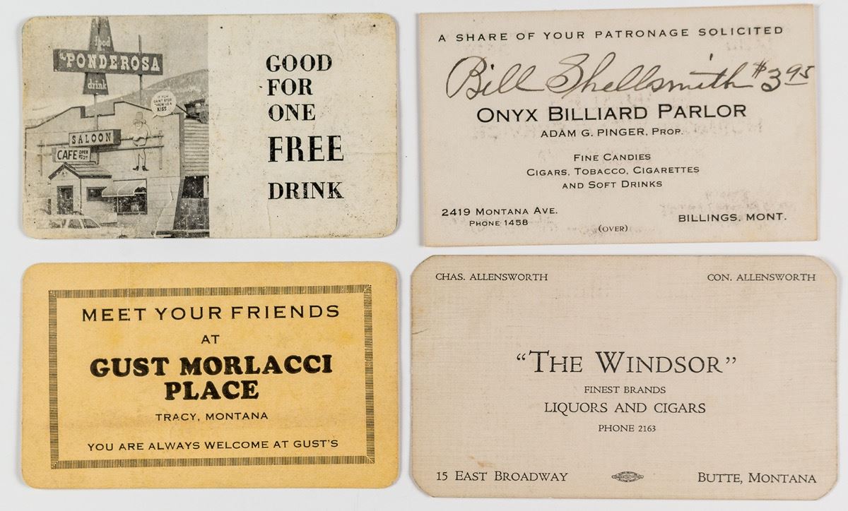 Cards: Ponderosa Saloon & Cafe // GF / One free Drink; H. Wolfe, HupMobile Taxi Service, Billings; The Windsor, Liquor and Cigars, Butte; Gust Morlacci Place, Tracy. City: State: Montana Date: Inventory# 38820