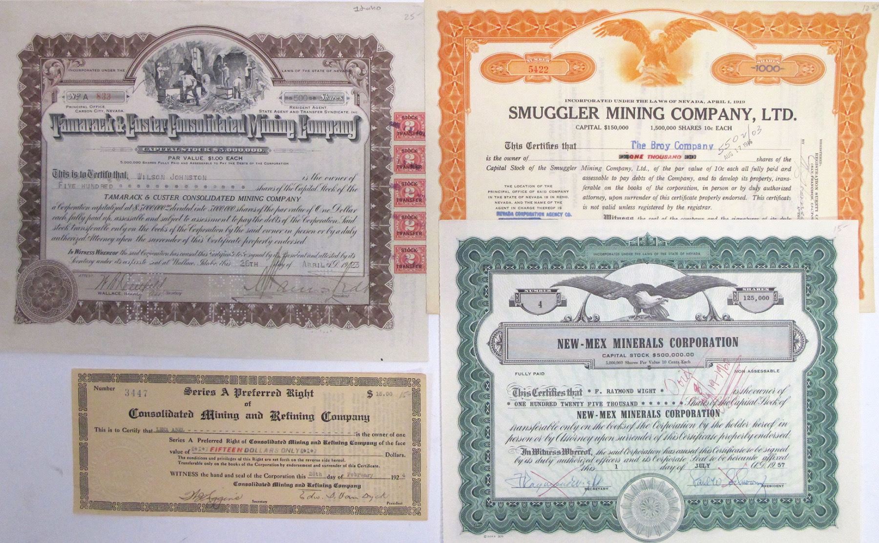 1) New-Mex Minerals Corp. Issued 1957, pen cancelled. Eagle vignette. 2) Cons. Mining & Refining Co. Issued 1924, not cancelled. 3) Smuggler Mining Co., Ltd. Issued in 1946, punch cancelled. Eagle vignette. 4) Tamarack & Custer Cons. Mining Company. Issued 1923, punch cancelled. Mining vignette. (Prag Collection) Date: 1923-1957 Location: HWAC# 60482