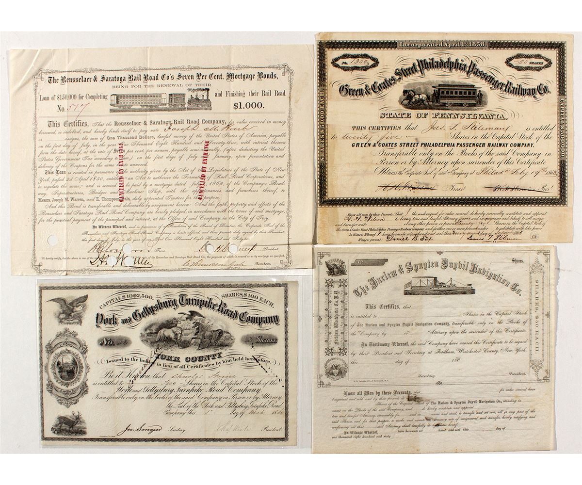 1) 1850 Rensselaer & Saratoga Rail Road Co's seven per cent mortgage bonds. A load of $150,000 for the completion of their rail road. Number 517 to Joseph M Hart(?). Early 1832 railroad. 2) 1864 York and Gettysburg Turnpike Road Company. York County. 2 shares issued to Charles Stine(?). Number 43. Nice vignette of horses playing in a field. Early Pennsylvania turnpike. 3) Green & Coates Street Philadelphia Passenger Railway Company stock. Number 1350 for 25 shares to James Stileman in 1863. Cancelled. Vignette of horse drawn street car. 4) Harlem & Spuyten Duyvil Navigation Company. unused c186-. Vignette of a steamer. Three of these pieces are Civil War era.