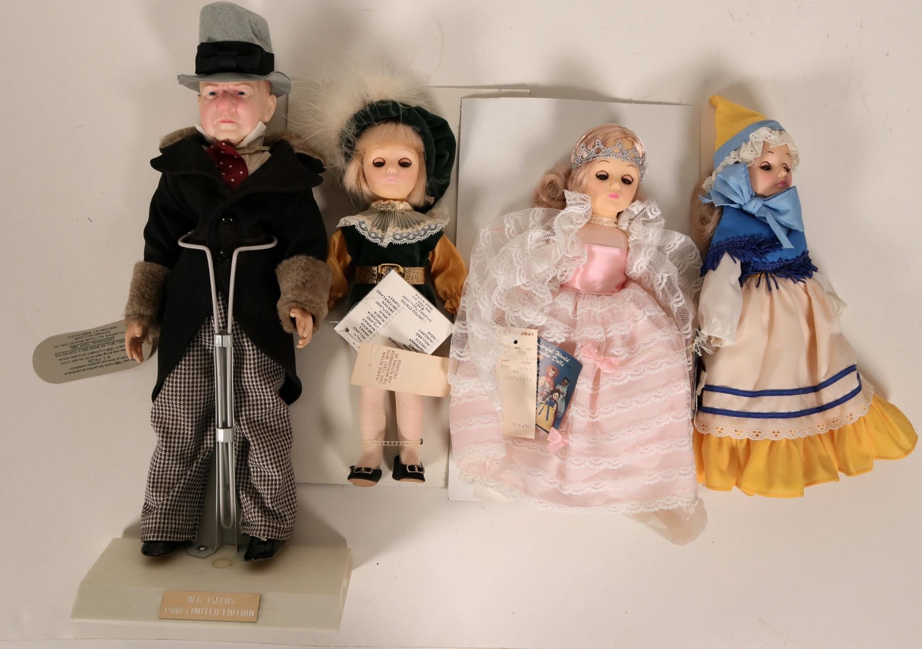 This is a collection of four EFFANBEE dolls. The largest is a W.C. Fields doll; a Cinderella doll with sleeping eyes #1176 NIB; Mother Goose doll with sleeping eyes #1193 NIB; and Prince Charming doll with sleeping eyes #1189 NIB.