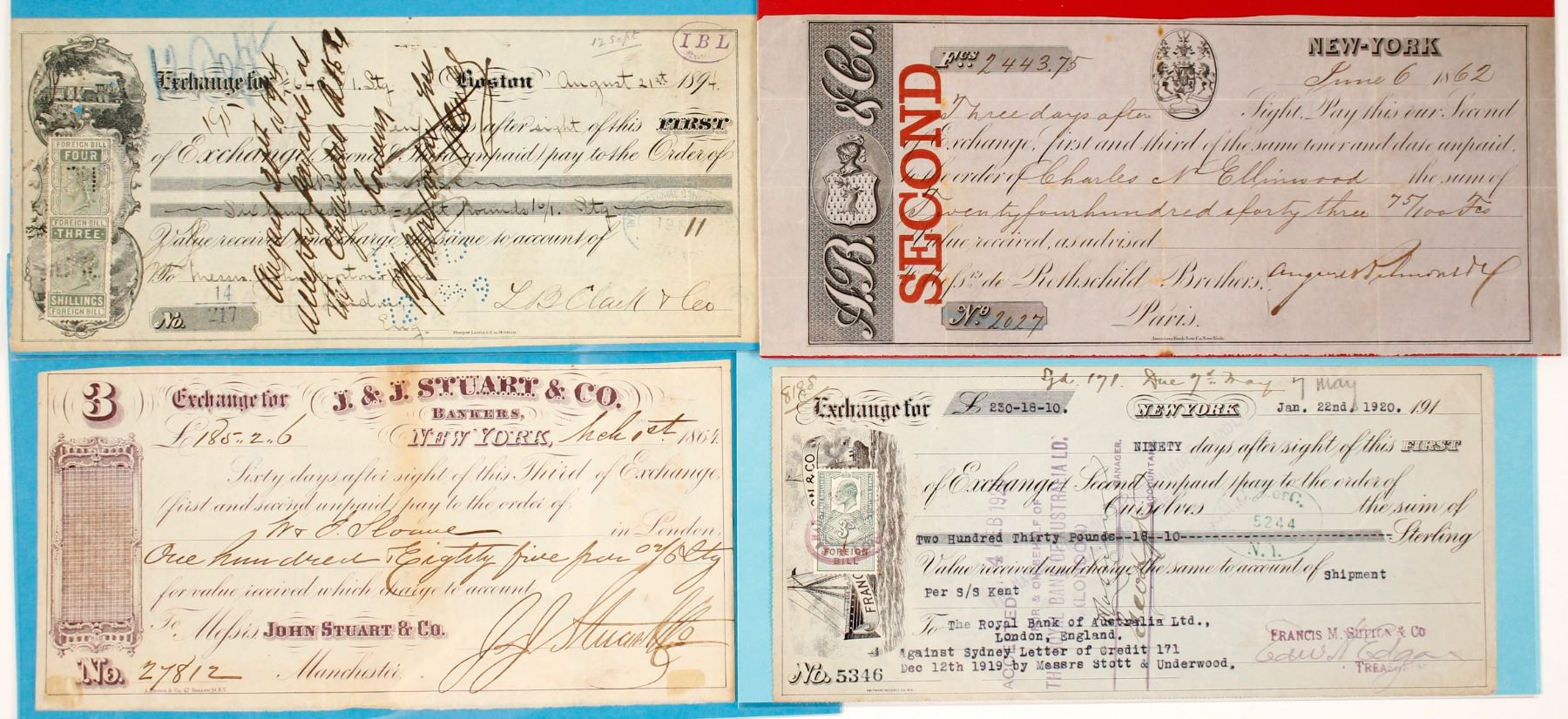 Lot of 4. 1) AB & Co. Second of Exchange, 1862, New York, for 2,443.75 francs. 2) 1864 3rd of Exchange, J&J Stuart & Co., New York. 3) 1894 Boston First of Exchange in sterling with two foreign bill adhesive stamps. 4) Francis M. Sutton & Co., 1920, New York, First of Exchange, paid in Sterling, boat vignette covered by 3 shilling stamp.