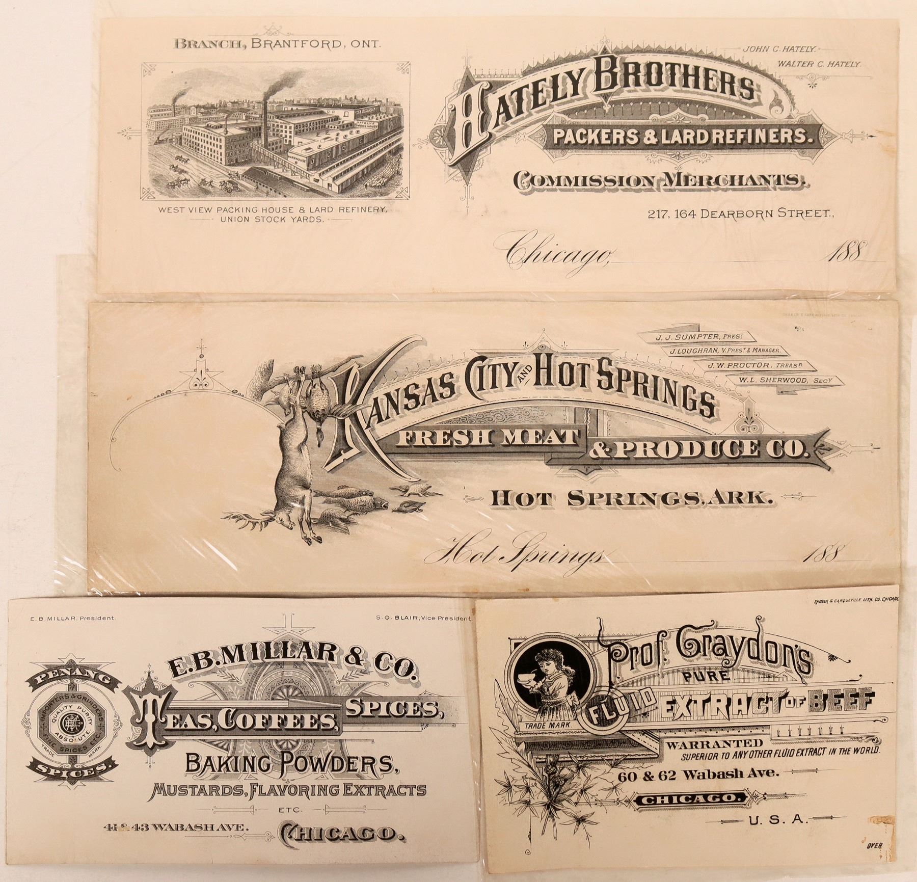 Lot of four advertising coupons for businesses specializing in food, in Illinois and Arkansas, c1870-1888. Larger two are approx. 4 x 8 inches. Includes two business cards, 3 x 5 inches. All are printed by Shober & Carqueville Litho Co., Chicago. Printers' proofs are a print or object that the manufacturer or printer receives as proof of their work. For further details, see photo.