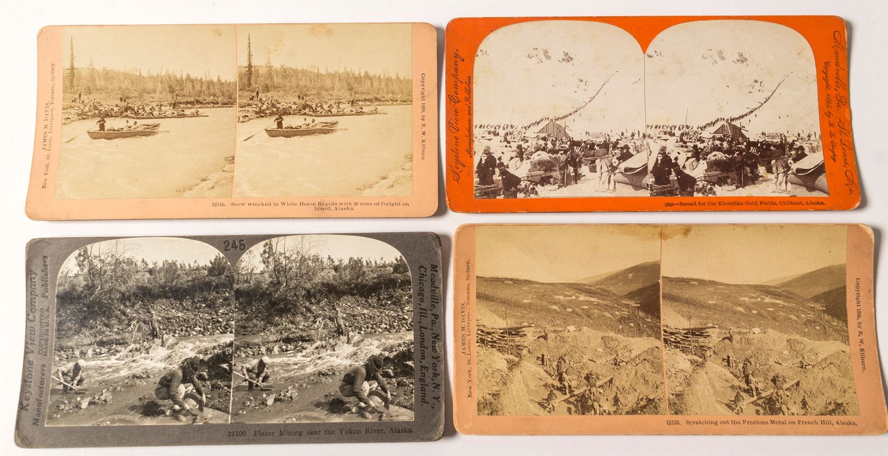 1) Iconic Keystone view No. 9191 of people Bound for the Klondike Gold Fields, Chilkoot, Alaska. 2) c.1899 Kilburn stereoview No. 13133, Scratching out the Precious Metal on French Hill, Alaska. Miners with sluice box. 3) c.1899 Kilburn 13143, Scow wrecked in White Horse Rapids with 20 tons of freight onboard, Alaska. 4) Keystone No. 21100, Placer Mining near the Yukon River, Alaska. Some wear (soiling, scuffs). Please inspect. (Prag Collection) Date: Location: Klondike, Alaska HWAC # 54763