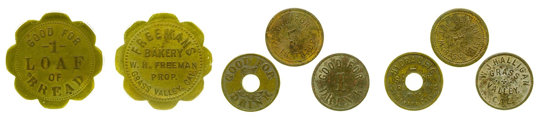 1) Freeman's Baker / W H Freeman Prop / Grass Valley, Cal // GF 1 Loaf of Bread. Slabbed by NCS. 2) Hydraulic Saloon / J R Hopkins Prop / Grass Valley // GF 1 Drink. Hole cancel affects the token. Still it is a Grass valley saloon. 3) W J Halligan / Grass Valley / Cal // GF 1 Drink. 4) W J Halligan / Grass Valley // GF 1 Drink. Different than #3. Date: Location: Grass Valley, California HWAC# 47313